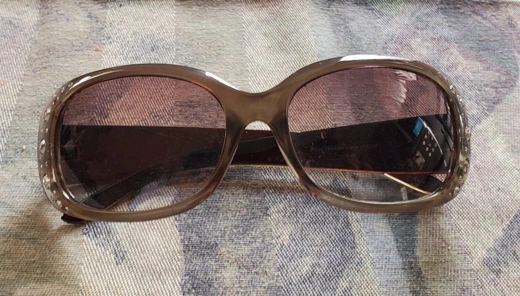 These sunglasses have a unique brown frame with rhinestone detailing around the edges. They're in good condition and ready for a new owner!