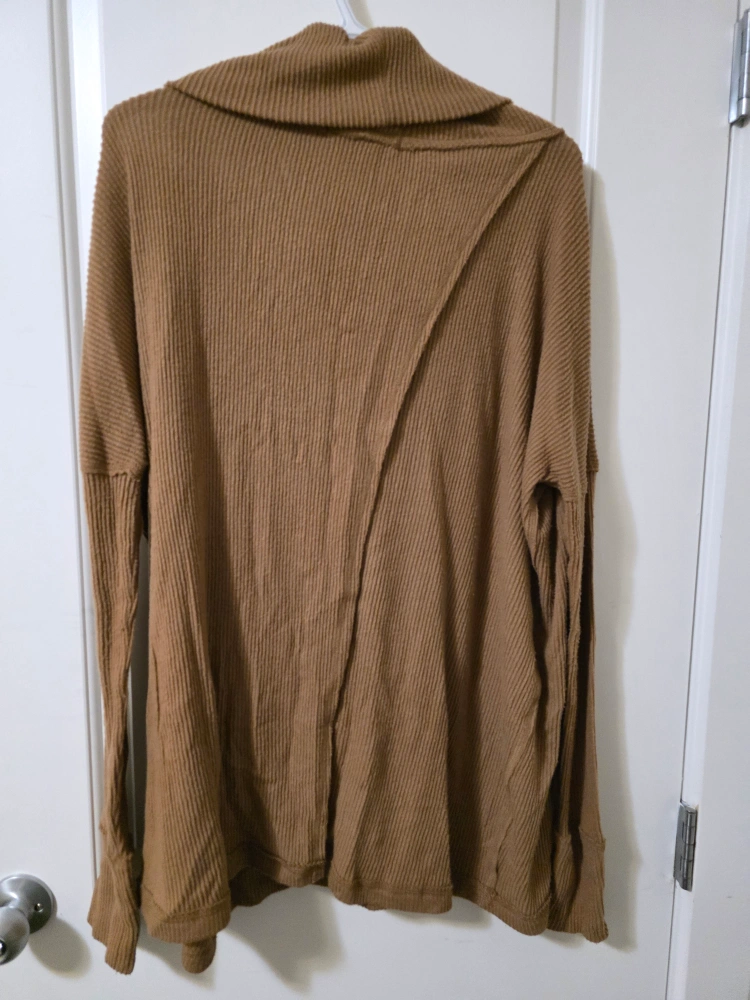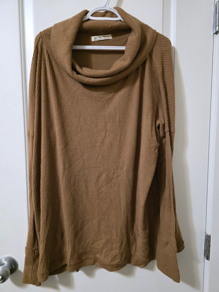 Selling a cozy Free People cowl neck sweater in a lovely brown colour. It's in great condition and perfect for layering during the cooler months. The waffle knit texture adds a nice touch!