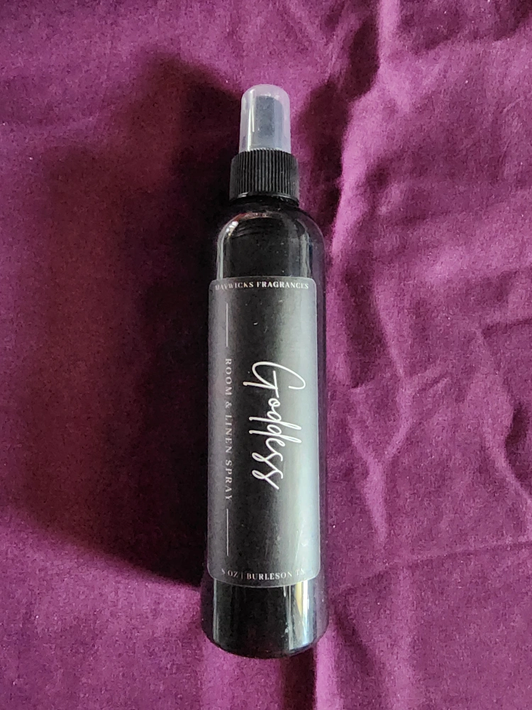 747Giving away a Mavwicks Fragrances Goddess Room & Linen Spray. This is an 8 oz bottle of room and linen spray from Mavwicks Fragrances. It's the Goddess scent, perfect for freshening up any space.