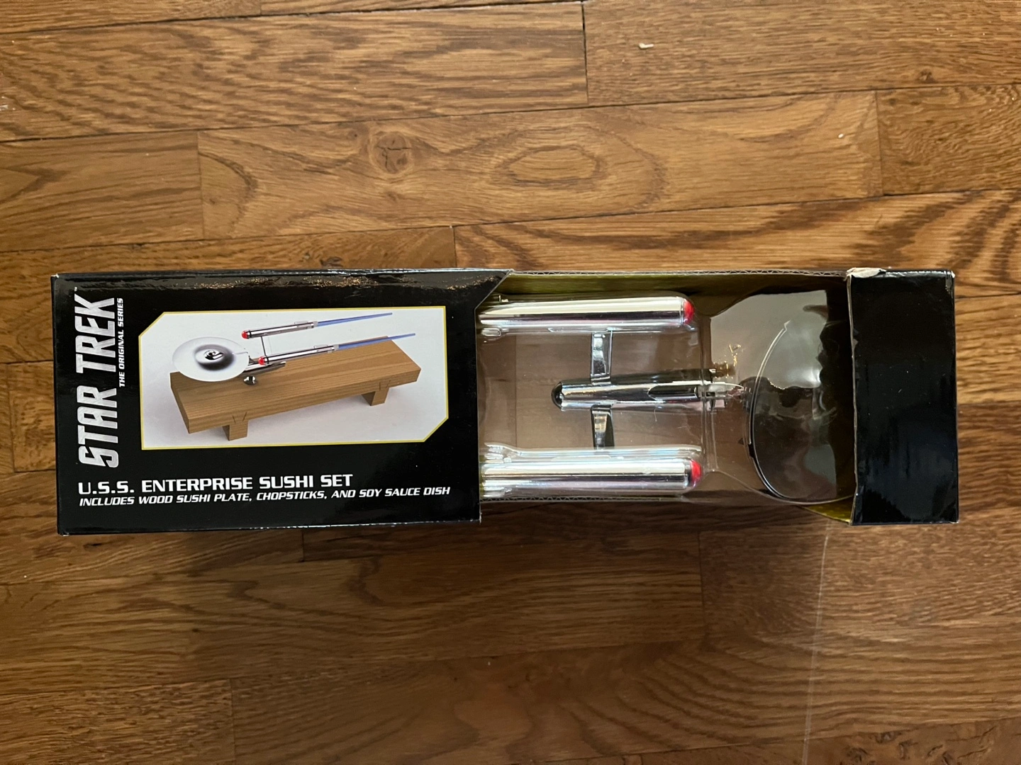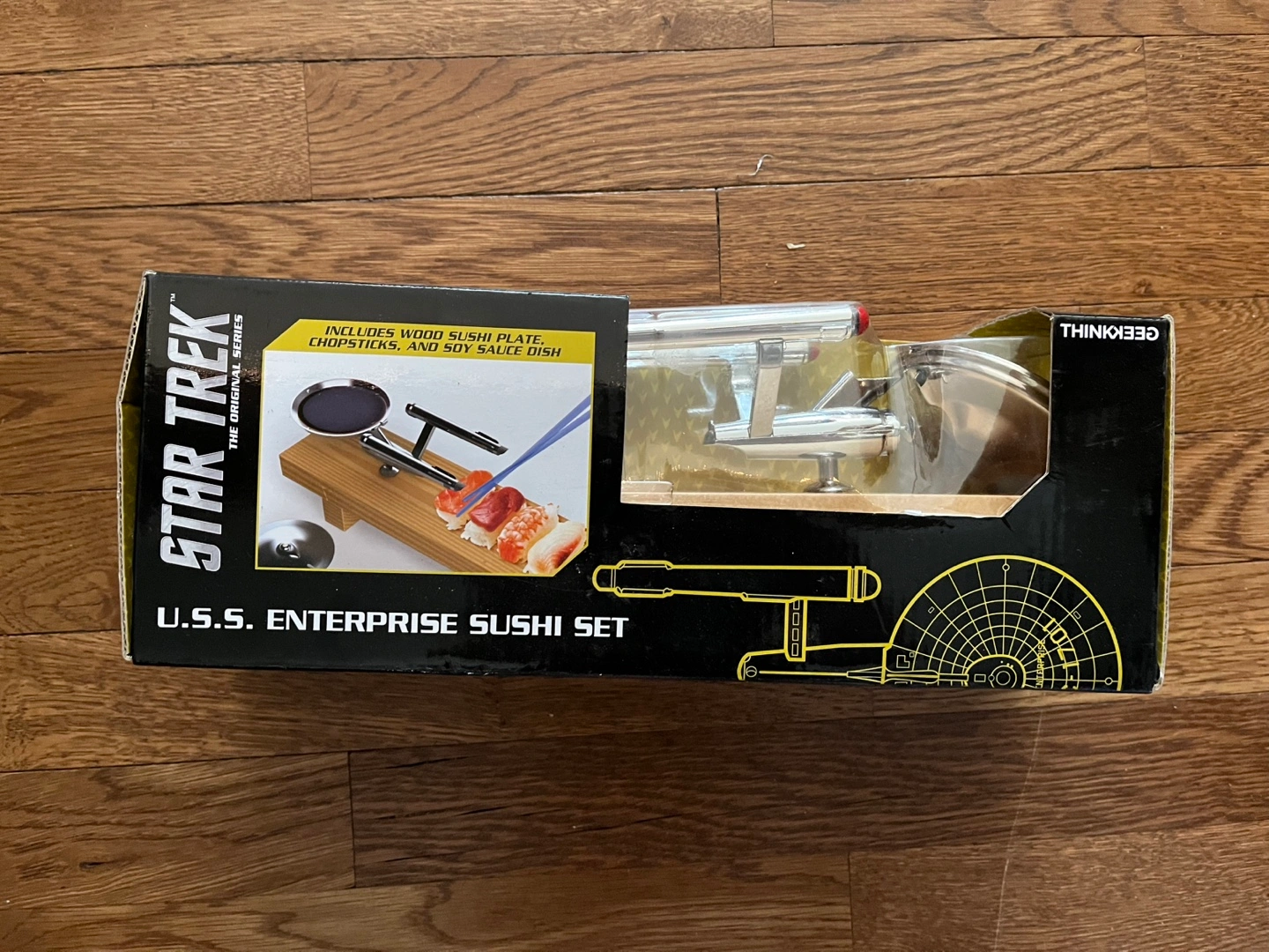 147Here's a brand new Star Trek U.S.S. Enterprise Sushi Set! It includes a wood sushi plate, chopsticks, and soy sauce dish. Perfect for any Star Trek fan!