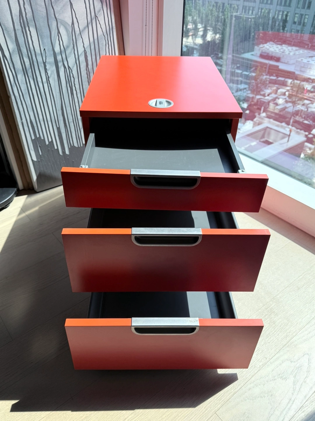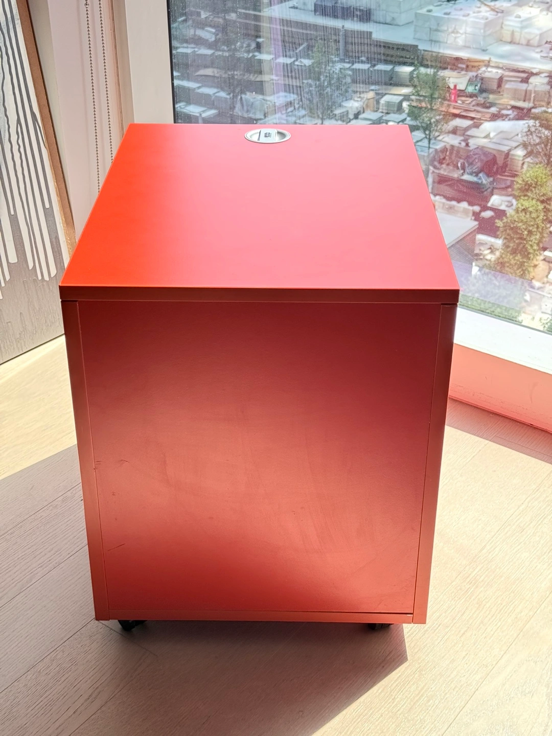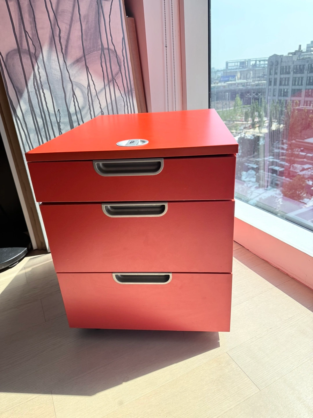 1000+IKEA Galant Drawer Unit on Castors Orange/Red Roll this drawer unit to where you need it or push it under a table. The combination lock keeps belongings safe and close by the workspace. It's in good condition with some marks on top and sides (see photos) The bottom drawers rub each other at from edges, top portion lifts up in one side (see photos) Originally paid $200, discounted to sell faster. Pick up, elevator and rolling cart!