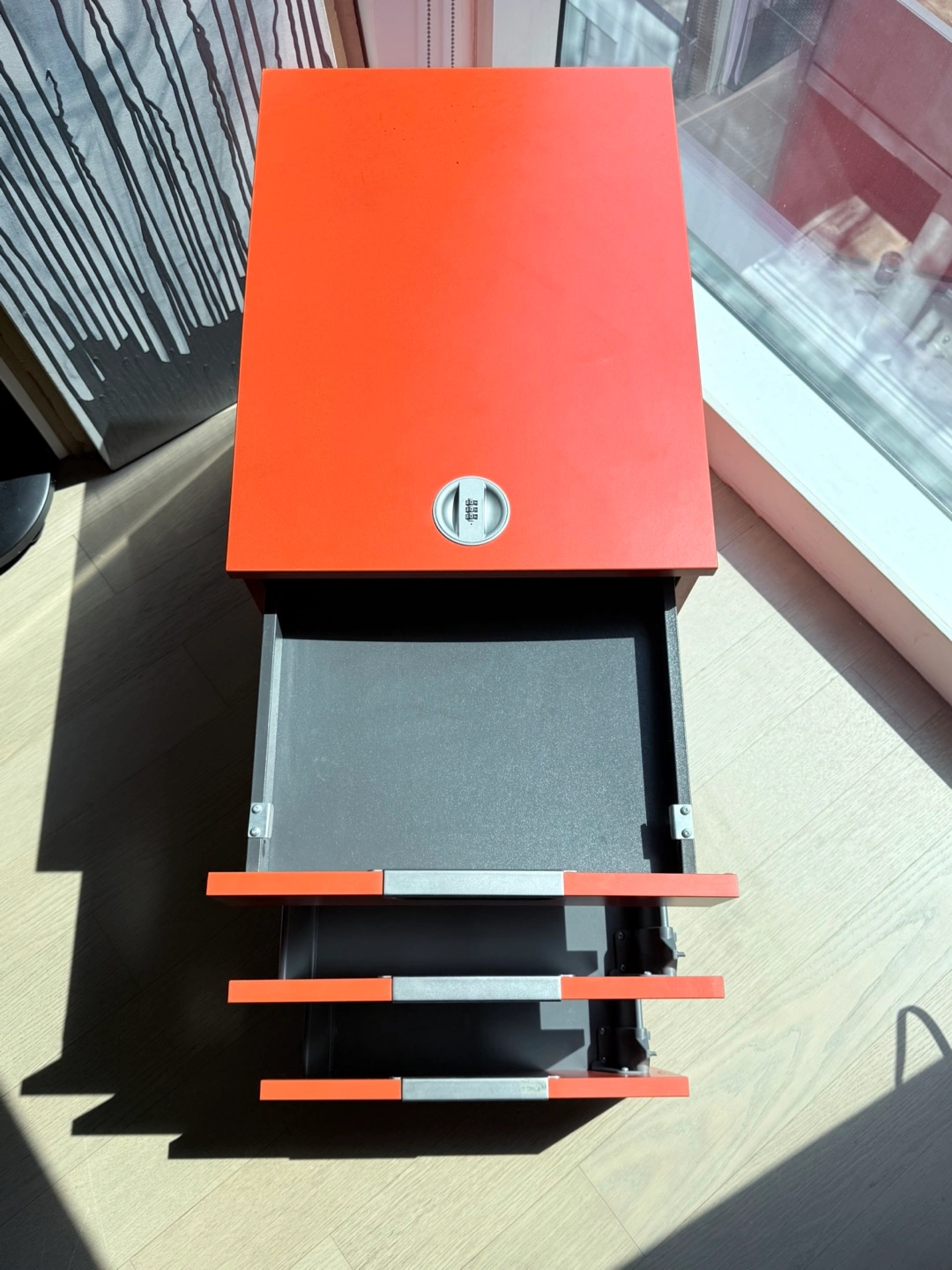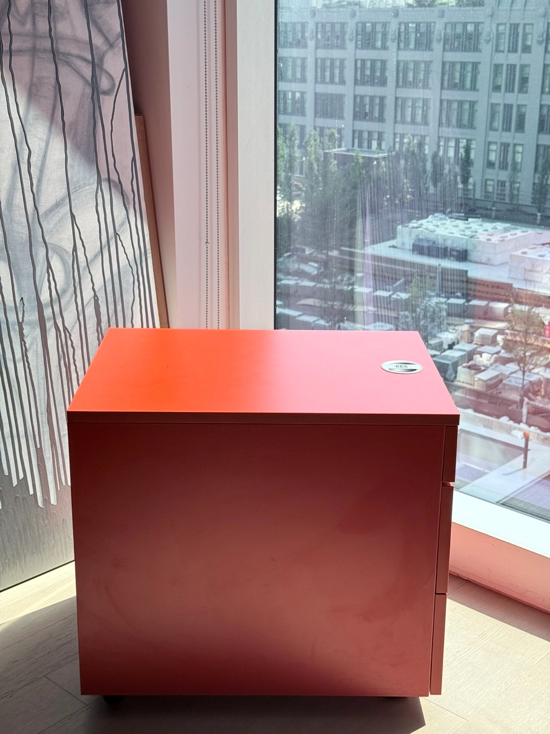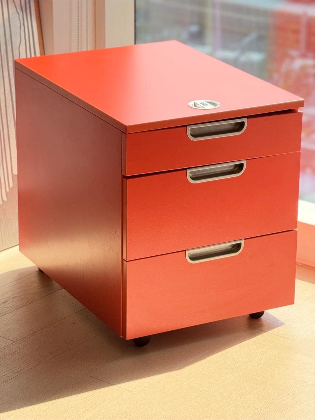 1000+IKEA Galant Drawer Unit on Castors Orange/Red Roll this drawer unit to where you need it or push it under a table. The combination lock keeps belongings safe and close by the workspace. It's in good condition with some marks on top and sides (see photos) The bottom drawers rub each other at from edges, top portion lifts up in one side (see photos) Originally paid $200, discounted to sell faster. Pick up, elevator and rolling cart!