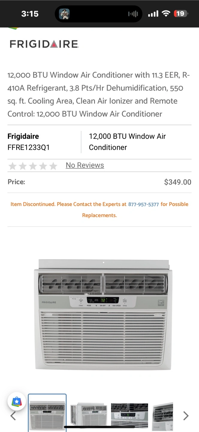 Selling a Frigidaire 12,000 BTU Window Air Conditioner. It features 11.3 EER, R-410A Refrigerant, 3.8 Pts/Hr Dehumidification, and covers 550 sq. ft. cooling area. It also has a clean air ionizer.