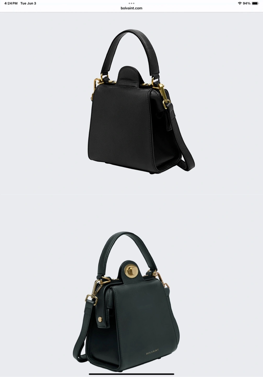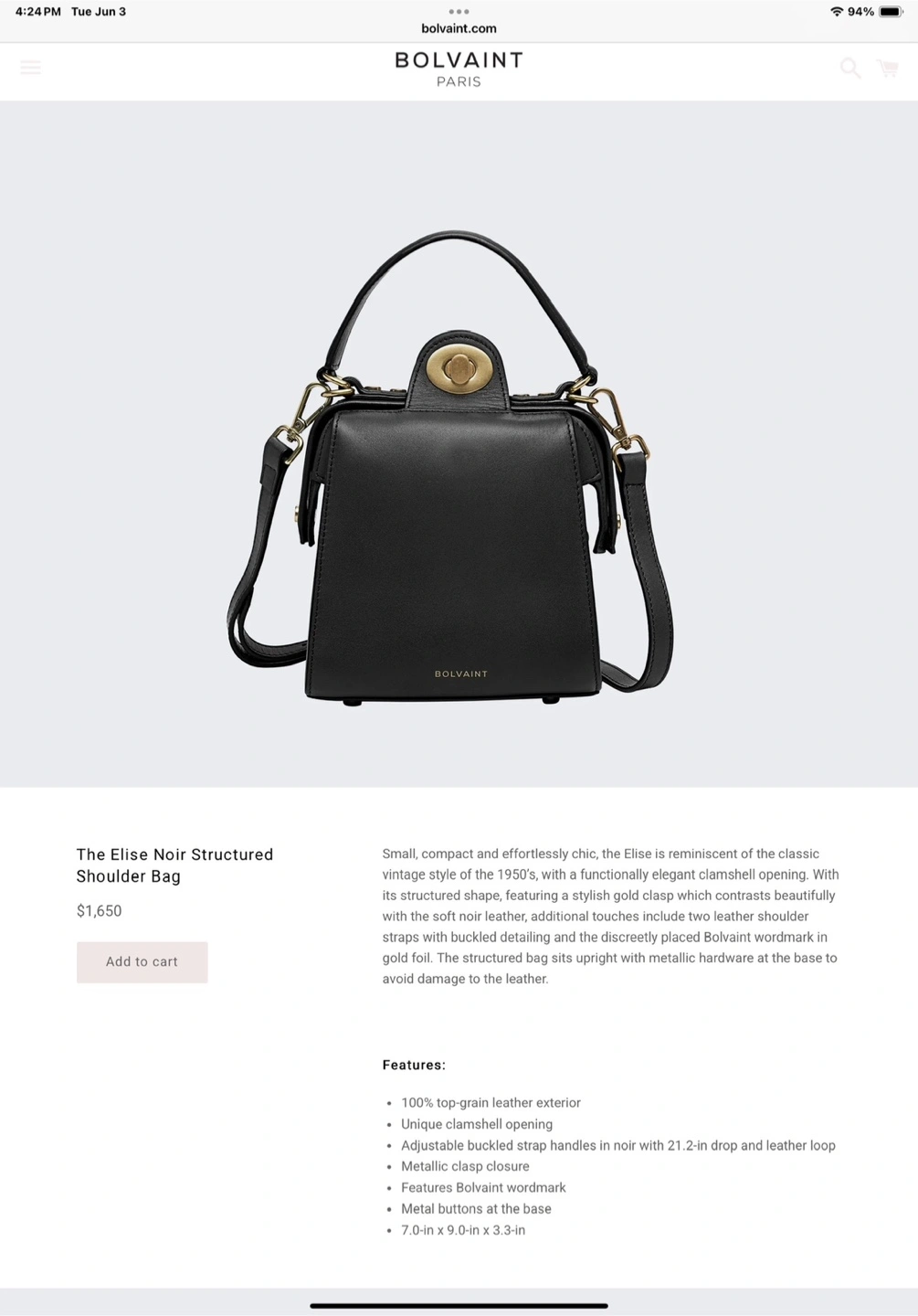 76Selling a Bolvaint Paris Elise Noir Structured Shoulder Bag! It's a compact and chic bag reminiscent of the classic vintage style of the 1950s. Features include: - 100% top-grain leather exterior - Unique clamshell opening - Adjustable buckled strap handles with a 21.2-in drop and leather loop - Metallic clasp closure - Metal buttons at the base - Dimensions: 7.0-in x 9.0-in x 3.3-in