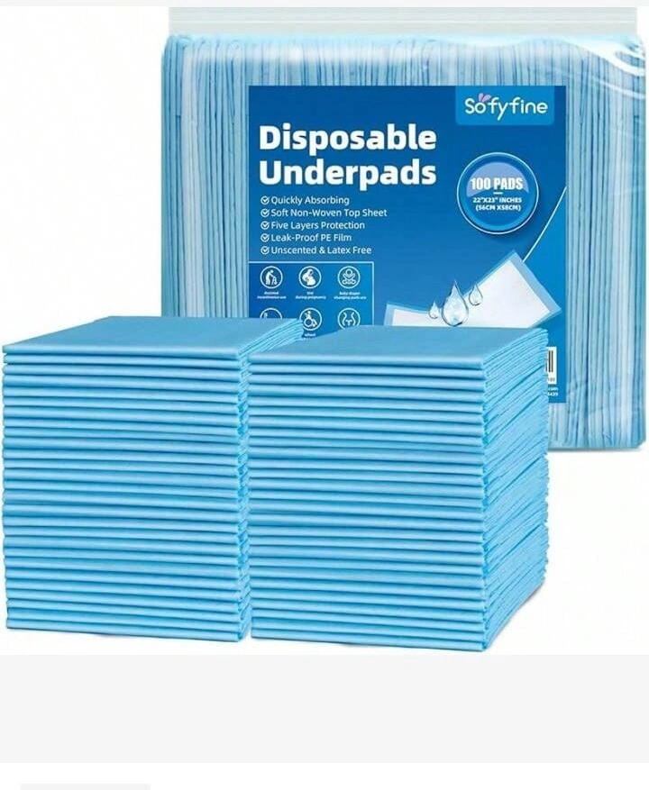 10Selling pack of 200 Sofyfine Disposable Underpads. This pack contains 100 pads, each measuring 22" x 23" (56cm x 58cm). They're designed for quick absorption with a soft, non-woven top sheet and five layers of protection. Plus, they feature a leak-proof PE film and are unscented and latex-free