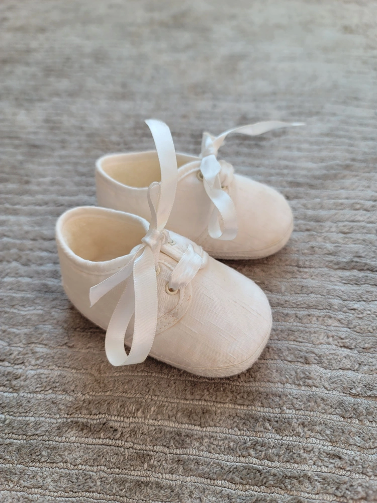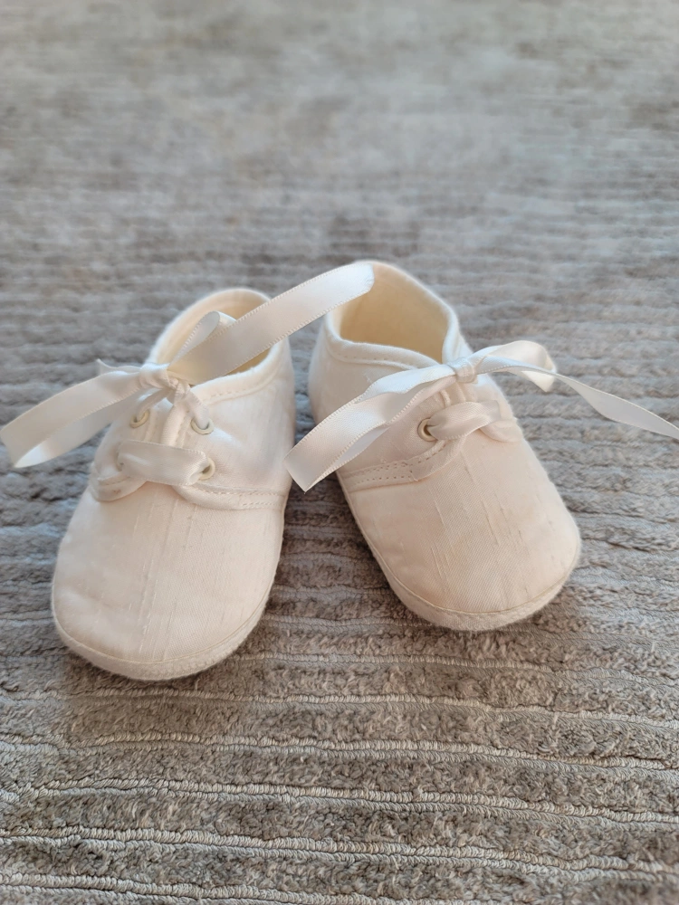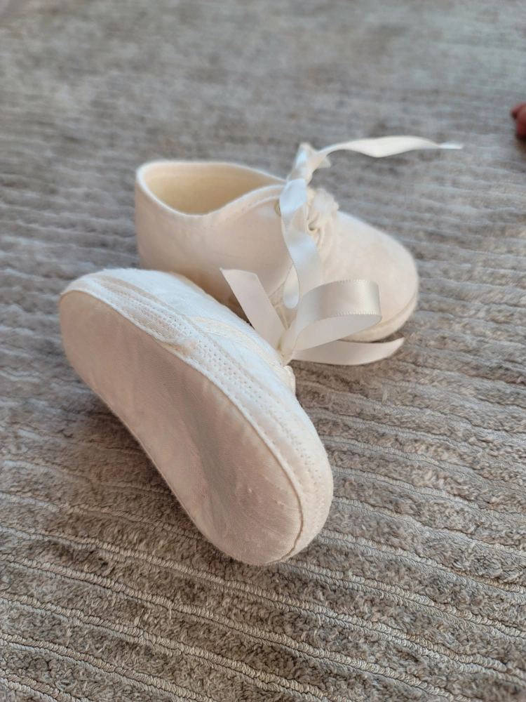 These are a pair of adorable white baby shoes, perfect for a special occasion or just for everyday wear. They feature a sweet ribbon tie and are in great condition. They're soft and comfortable for your little one's feet