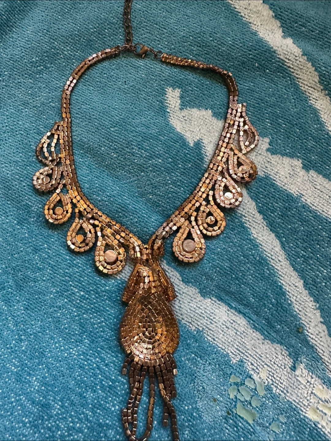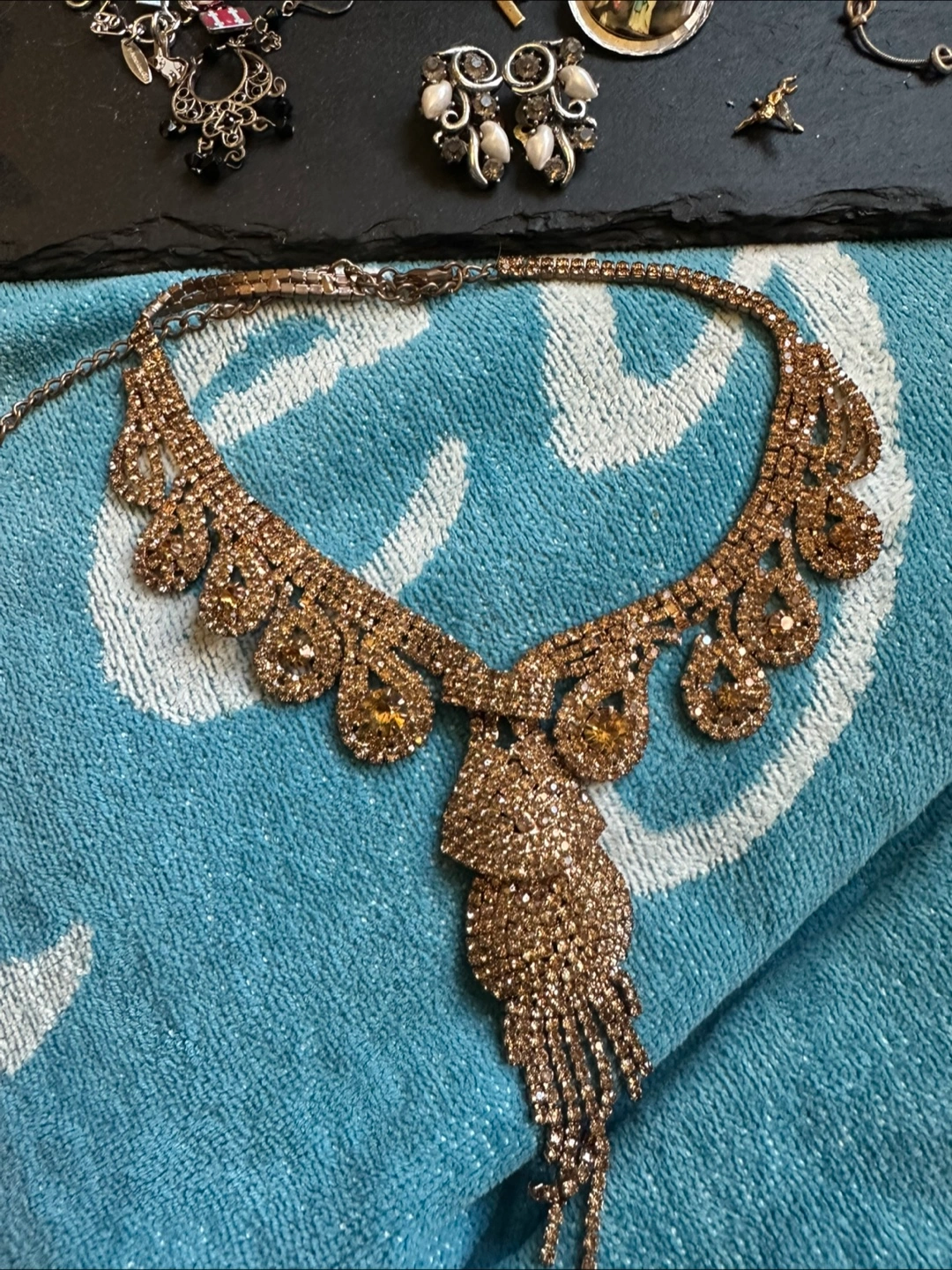 189This is a vintage rhinestone statement necklace. It features a unique design with intricate detailing and a beautiful gold/bronze tone. Perfect for adding a touch of vintage glamour to any outfit!