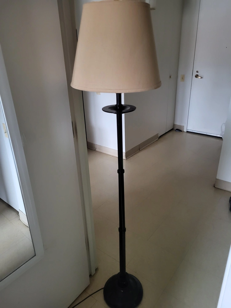 Selling a floor lamp with a beige shade. It has a black stand. This lamp would be a great addition to any room!