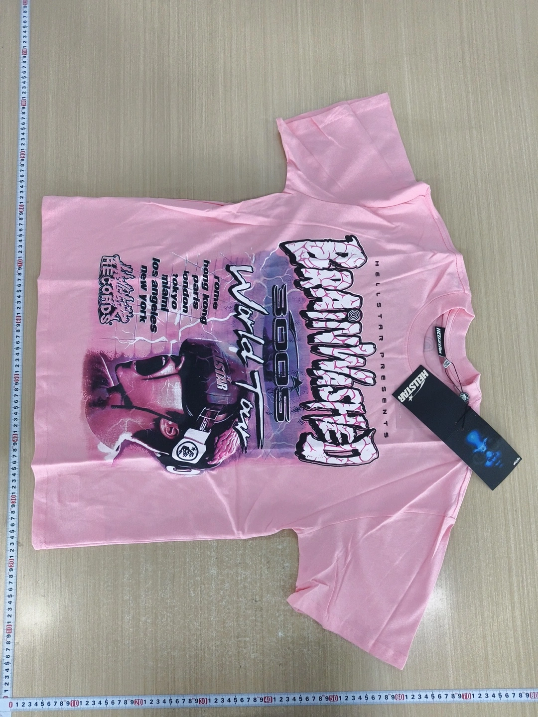 Selling a Hellstar Brainwashed World Tour T-shirt in pink! It's a size L. The design features a cool graphic with cities like Los Angeles, New York, Miami, Tokyo, and more. Perfect for fans of the brand or anyone who likes unique tees