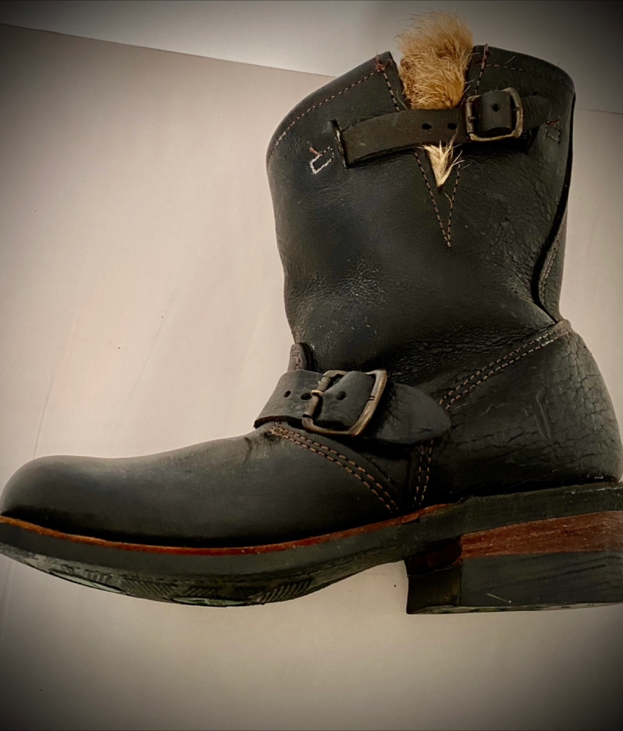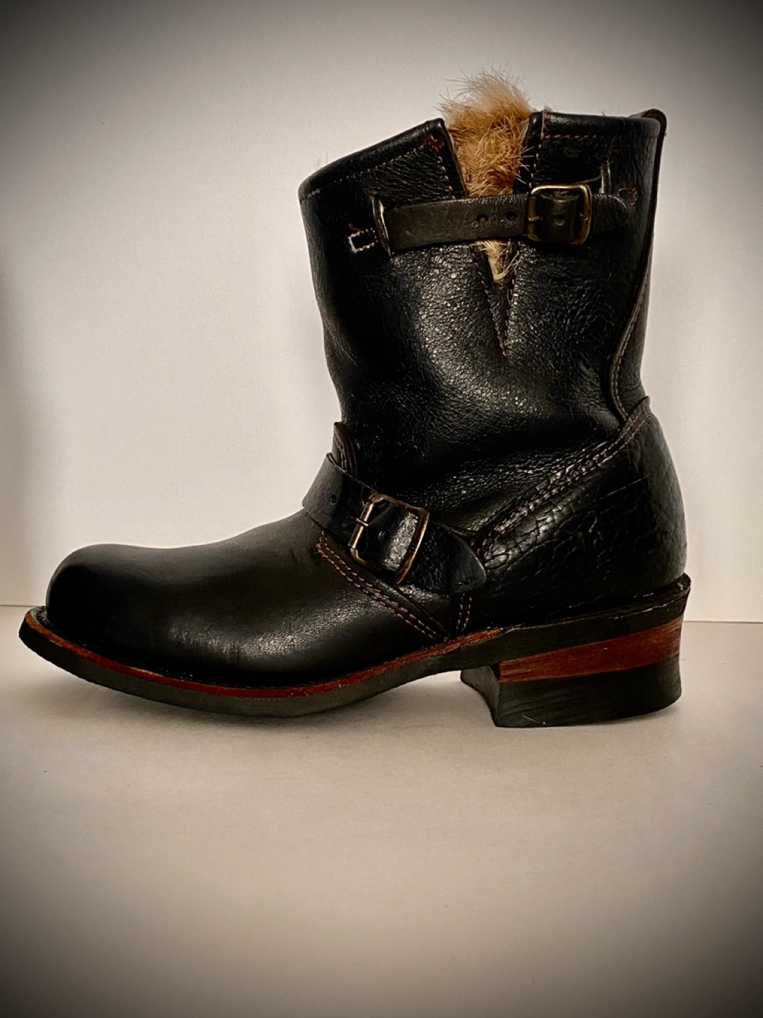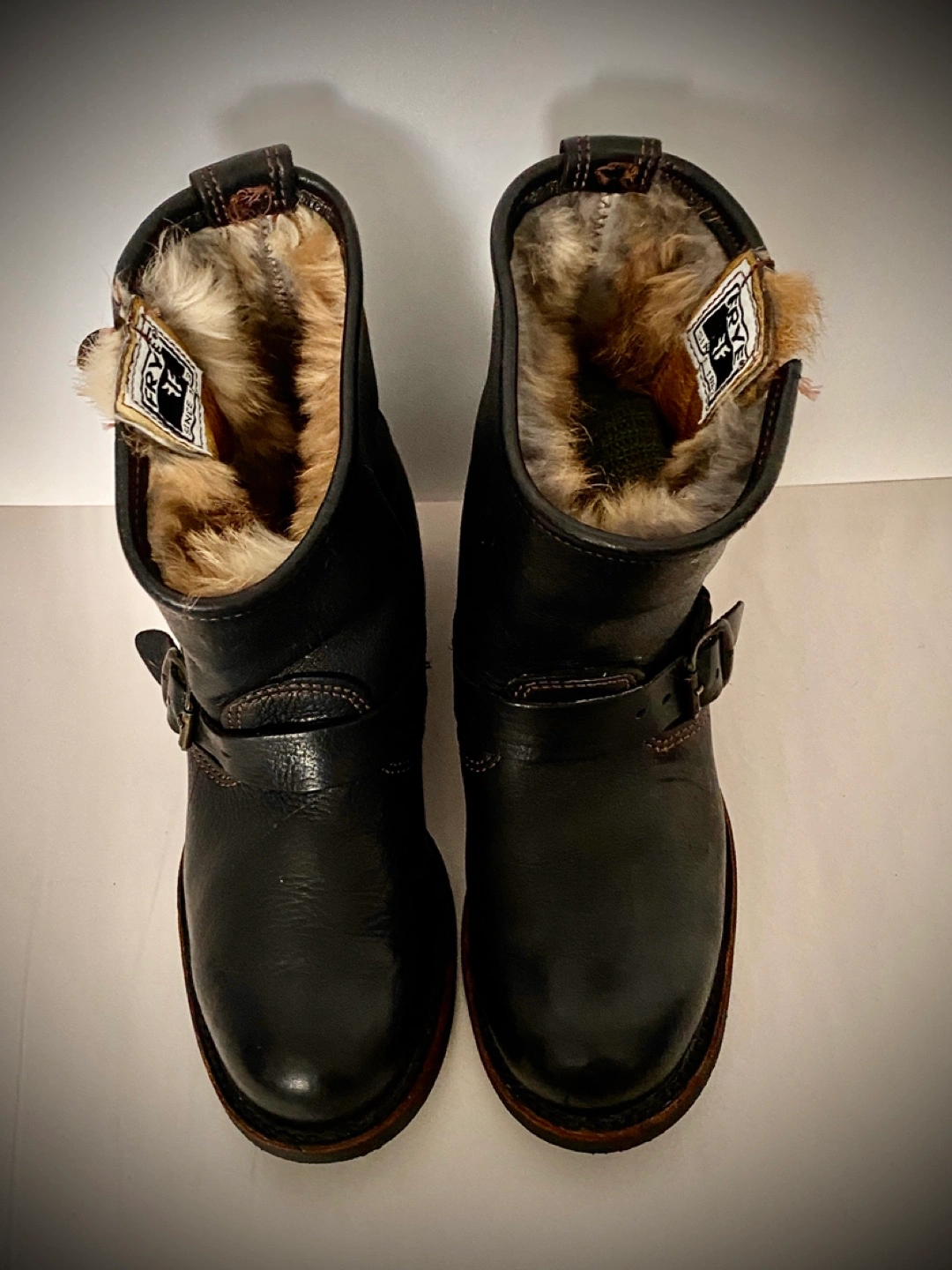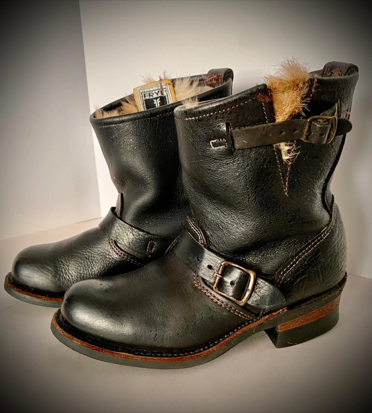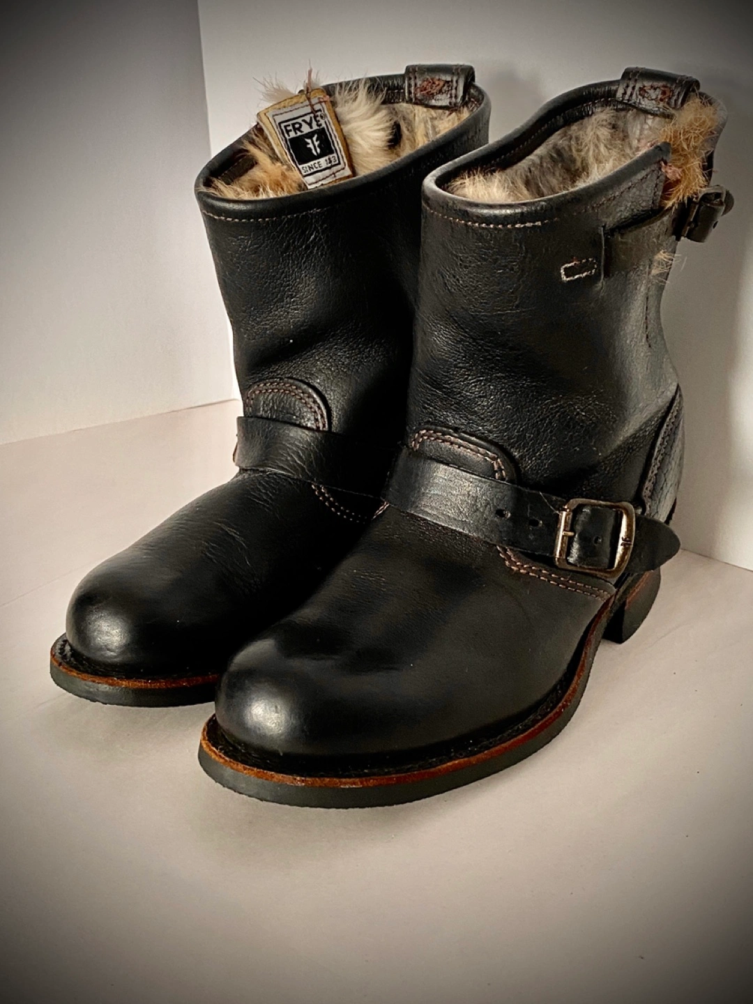 Selling a pair of Frye black leather moto boots size 6. They feature a classic moto style with buckle detailing, fur lining, and a comfortable fit. Perfect for adding an edgy touch to any outfit!
