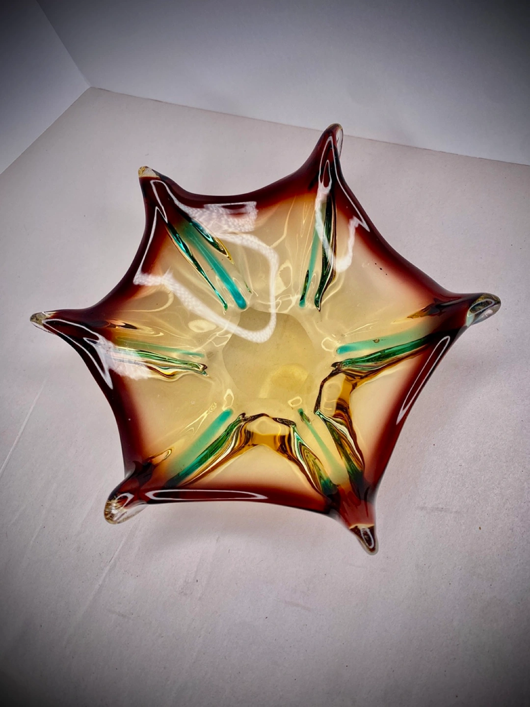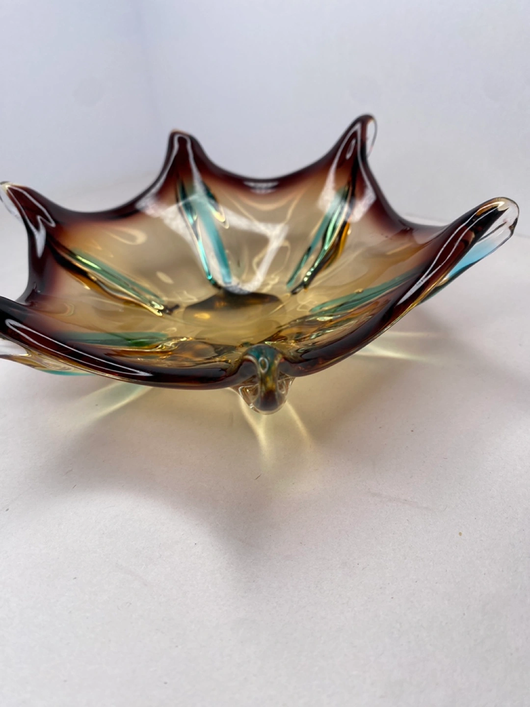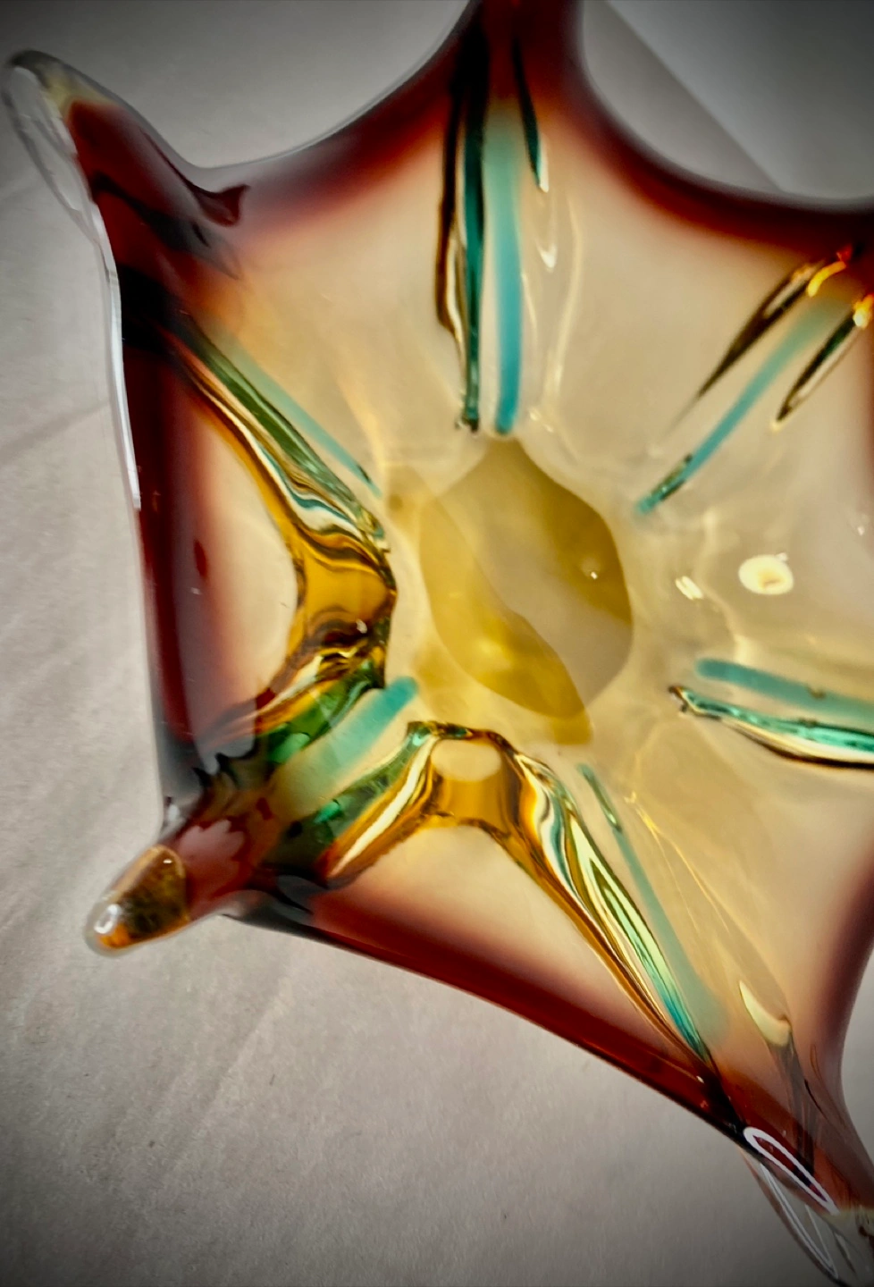 Beautiful vintage art glass bowl in a Murano style. It features a unique star shape with amber, brown, and turquoise accents. Perfect as a decorative piece! A real stunner. Pickup on Astoria Blvd South and 37th Street.