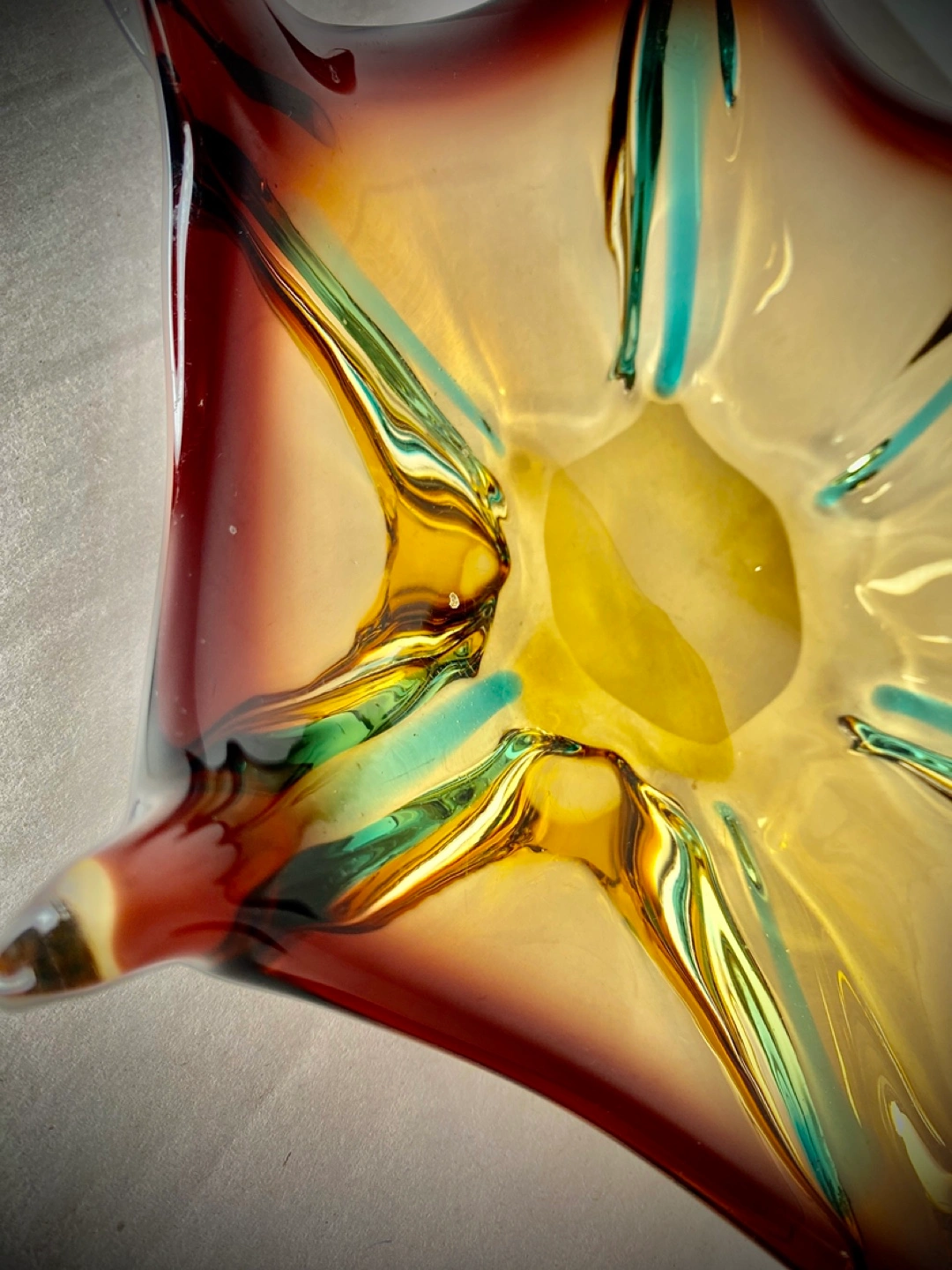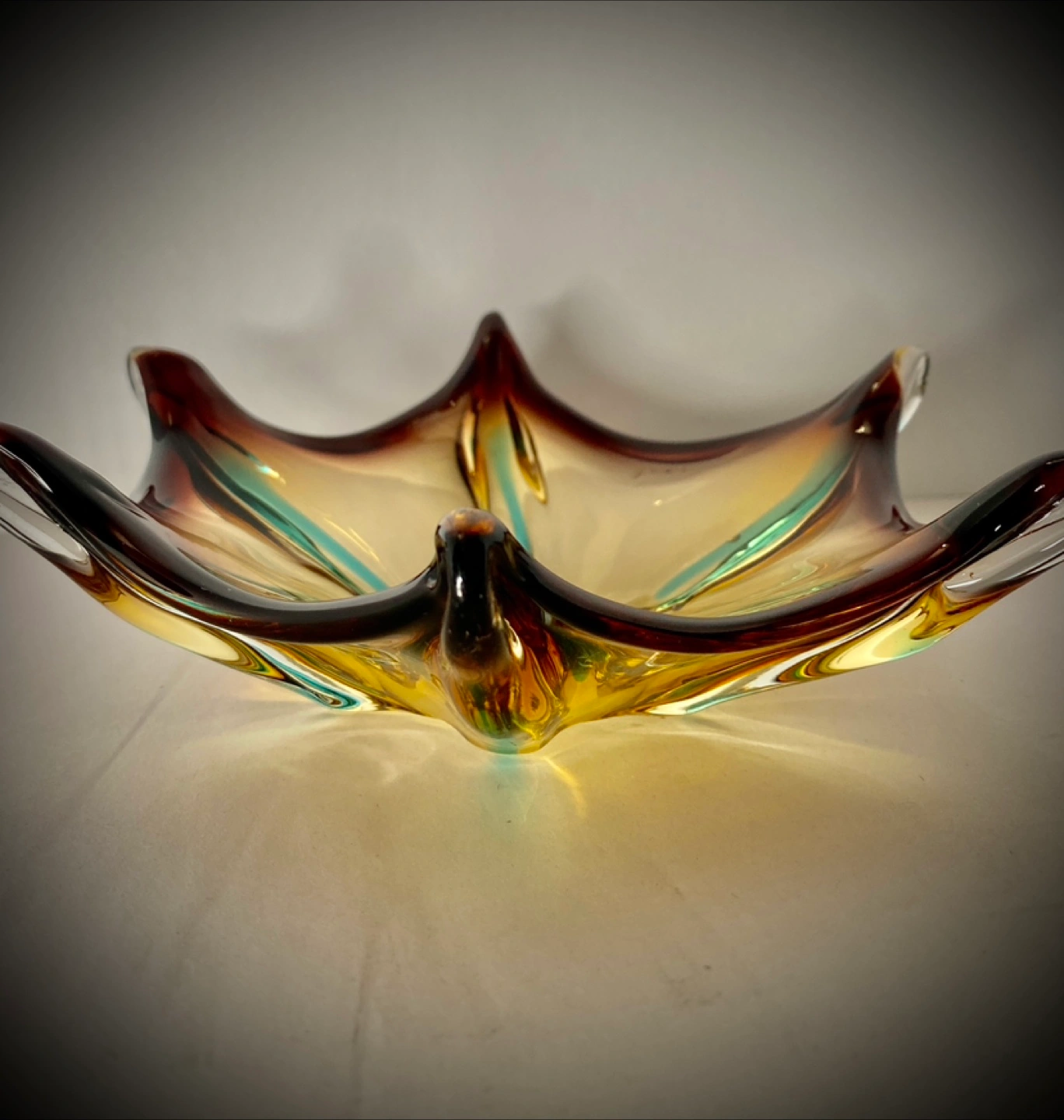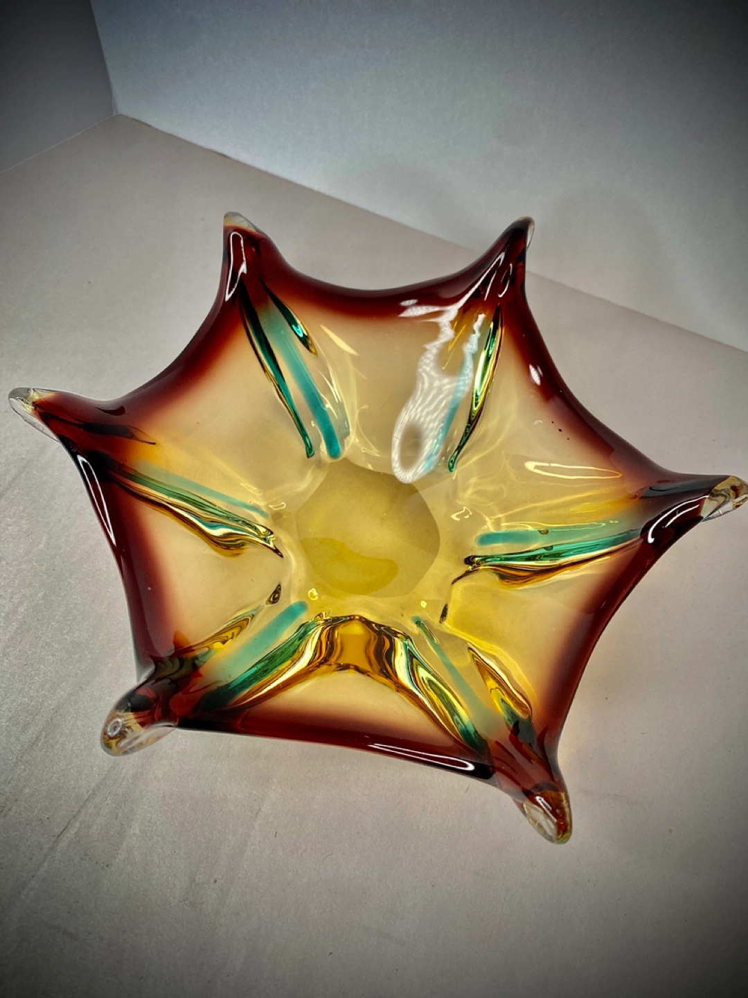 Beautiful vintage art glass bowl in a Murano style. It features a unique star shape with amber, brown, and turquoise accents. Perfect as a decorative piece! A real stunner. Pickup on Astoria Blvd South and 37th Street.