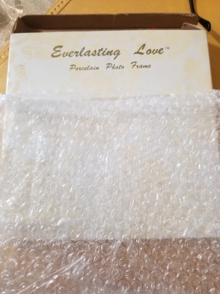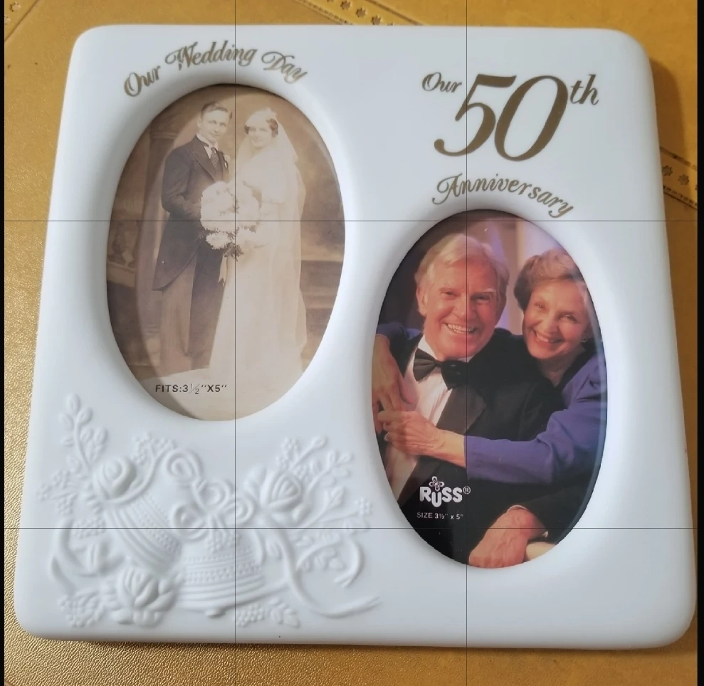 Selling an Everlasting Love porcelain photo frame! It features spaces for two photos, one labeled 'Our Wedding Day' and the other 'Our 50th Anniversary'. The frame is white and comes with its original box and packaging. Cash Only. Meet in public place. serious inquiries only.