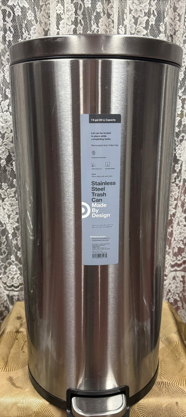 91Selling a stainless steel trash can from Target's Made by Design line! It has a 7.9 gallon (30 L) capacity and features: - A removable inner bucket for easy cleaning - Fingerprint-resistant finish - Soft-close lid - Durable pedal