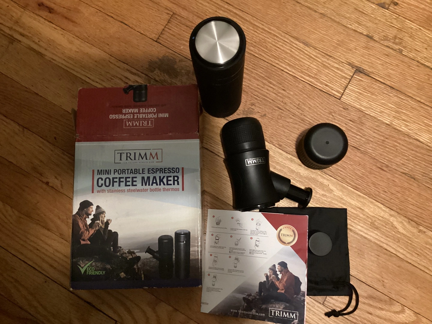 Open but never used. Selling a TRIMM mini portable espresso coffee maker! It comes with a stainless steel water bottle thermos. The box is included, along with all the original components and instructions. It's eco-friendly too!