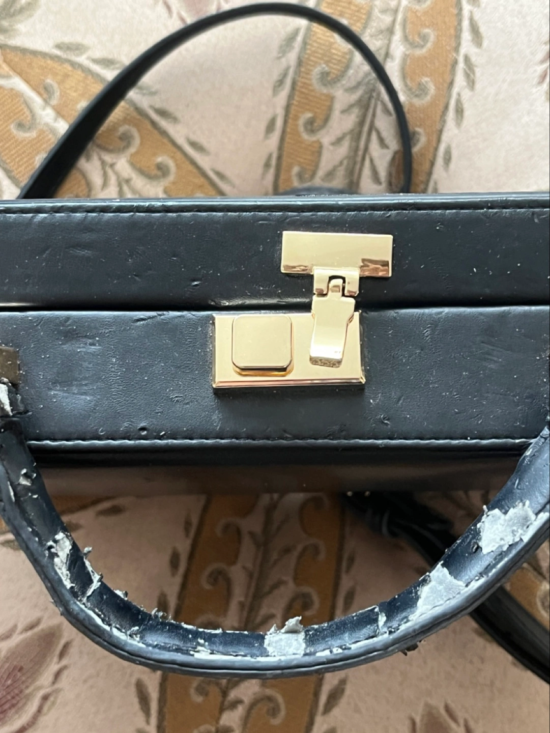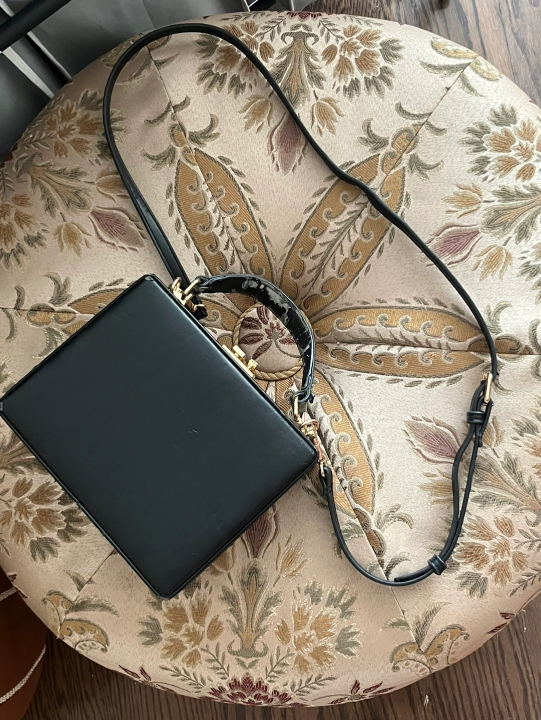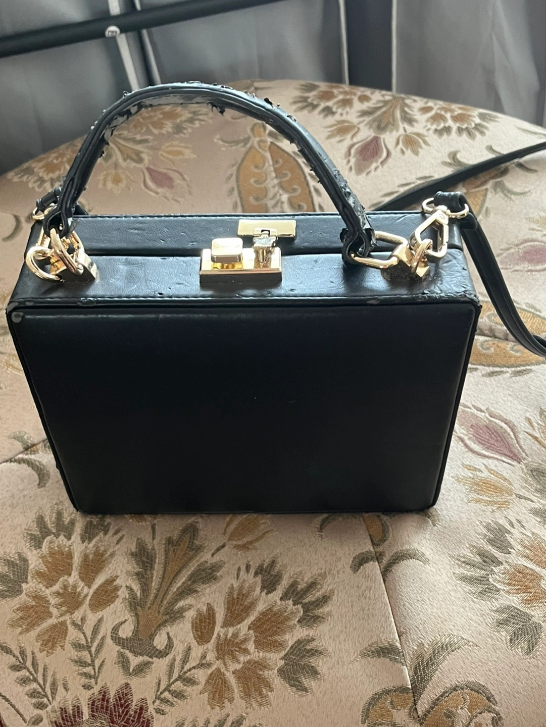 Selling a black box bag from Street Level. It has a gold-colored clasp and a small inner pocket. Please note that the handle shows signs of wear. This purse looks almost identical to the very expensive one by Mark Cross ! Unfortunately, this bag is showing a lot of signs of where and the black polyurethane coating is coming off in many spots. If you can get it refurbished or you are feeling crafty and can fix it up it is an excellent well loved bag. Comes with a Crossbody strap and there is a tiny zipper compartment inside for credit cards, cash business cards and a little lipstick. vegan leather