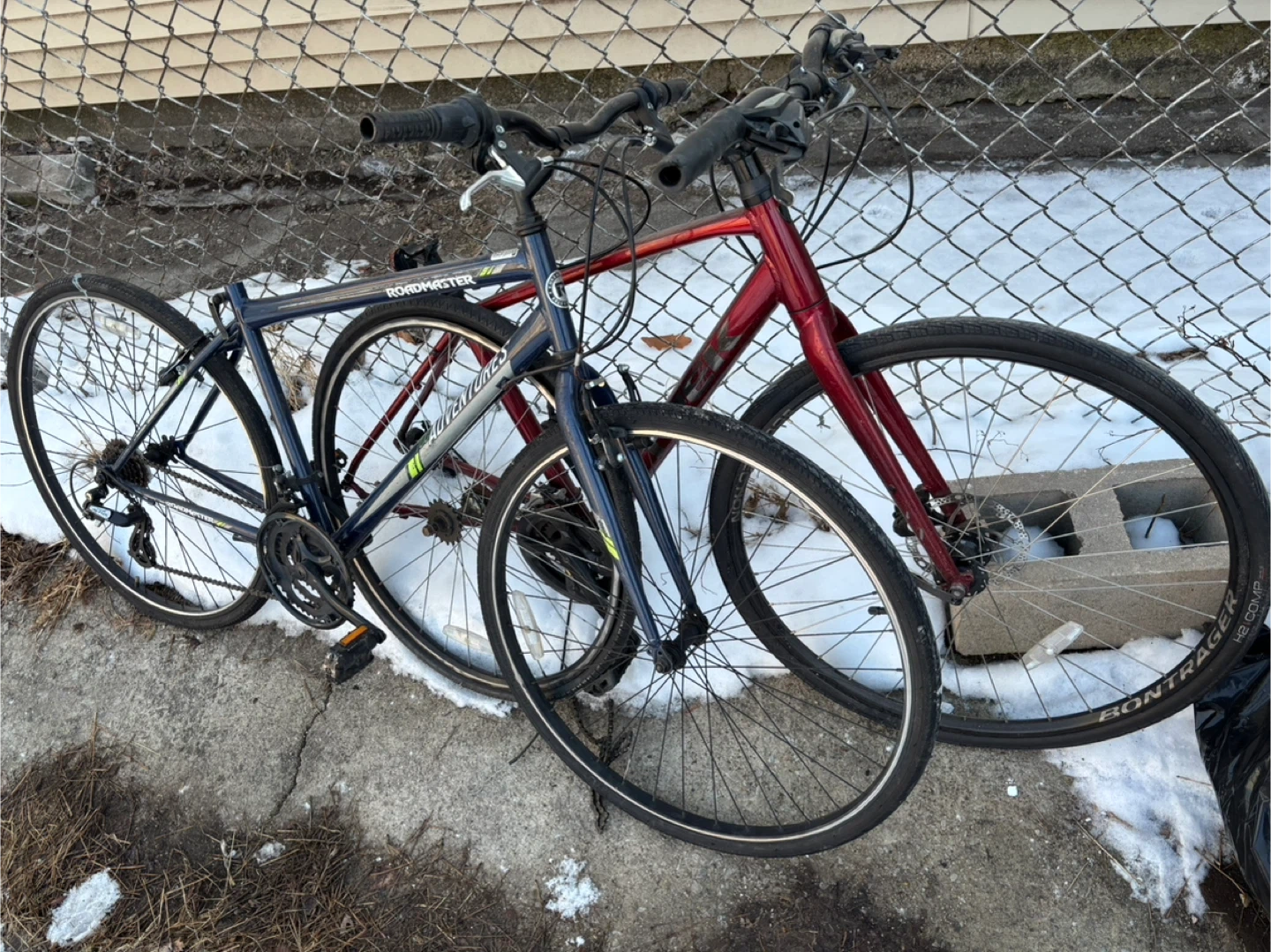 Selling a blue Roadmaster bike and a red road bike. Both bikes are suitable for commuting or recreational riding. They're in used condition with some wear, but still functional.
