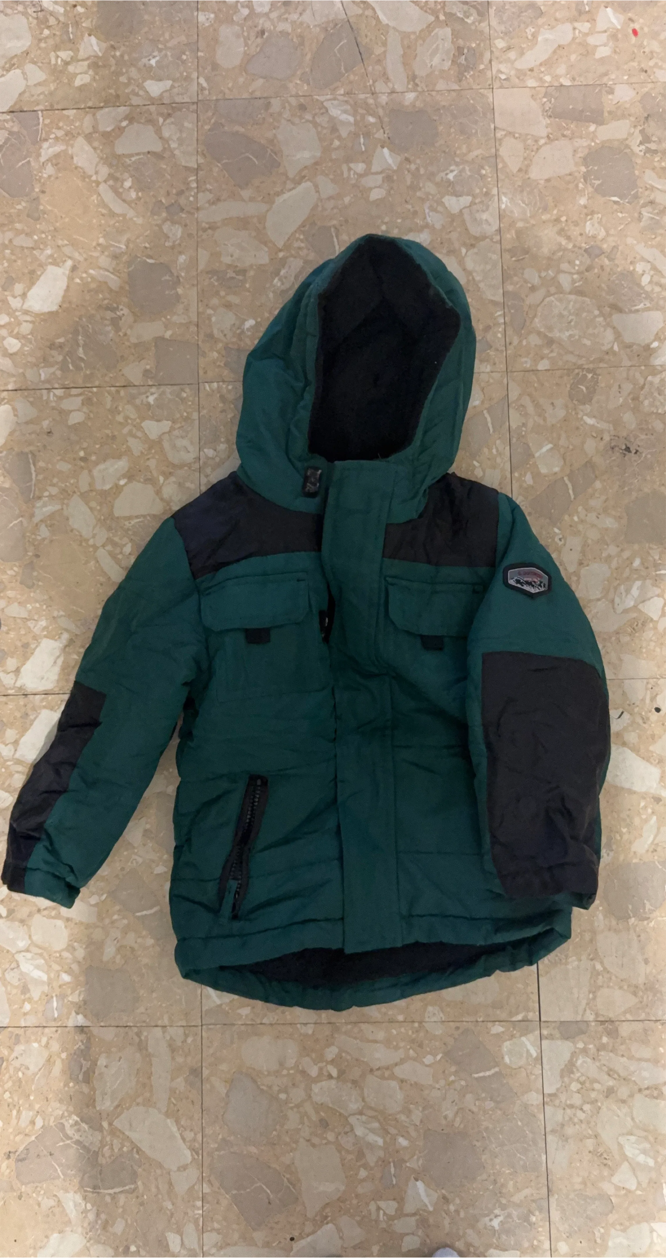 This boys' puffer jacket is a deep green with black accents on the shoulders and sleeves. It features a full zip front and a hood lined with black material. Two chest pockets and a zippered pocket on the side add convenience.