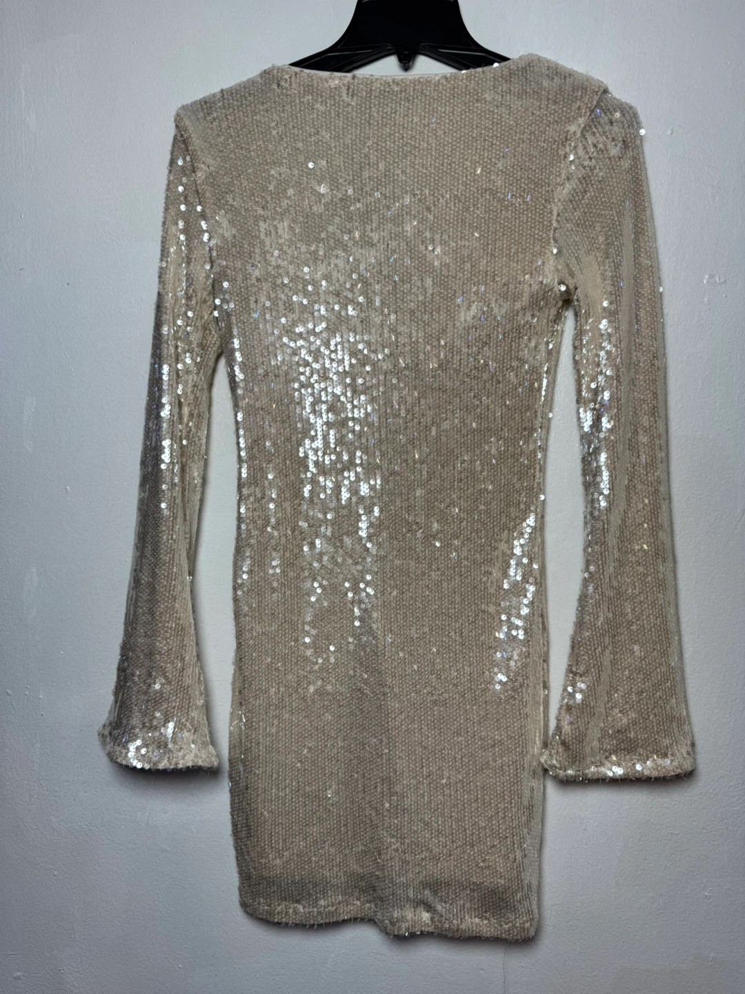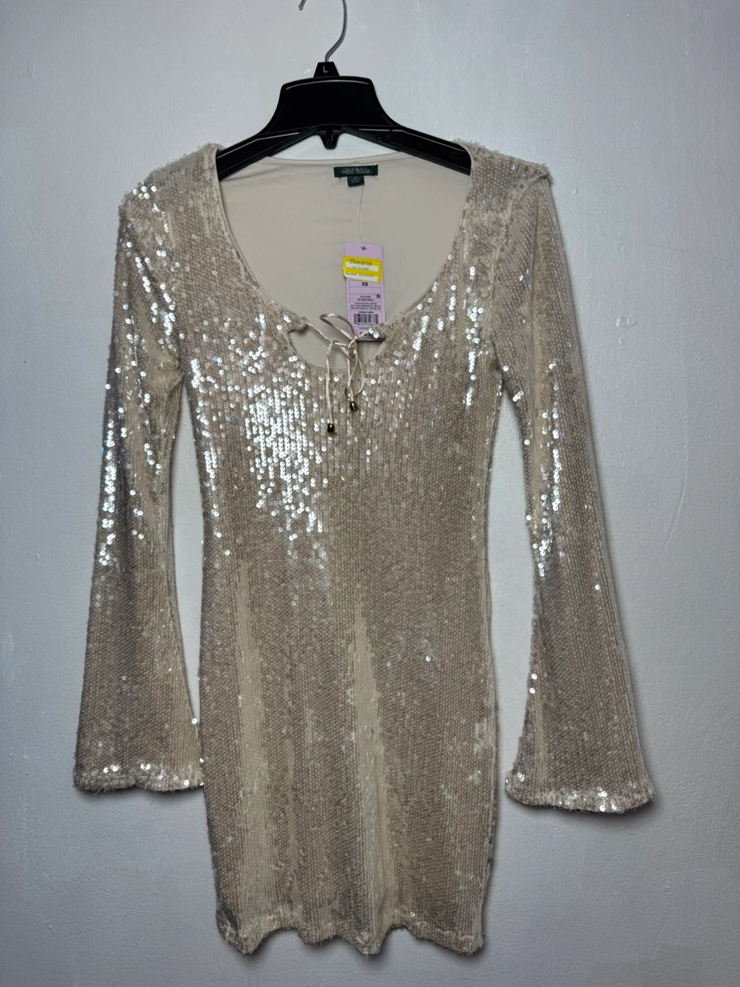 This Wild Fable dress features a full sequin overlay. It's a size XS with a lace-up neckline. Bell sleeves add extra flair to this sparkling piece!