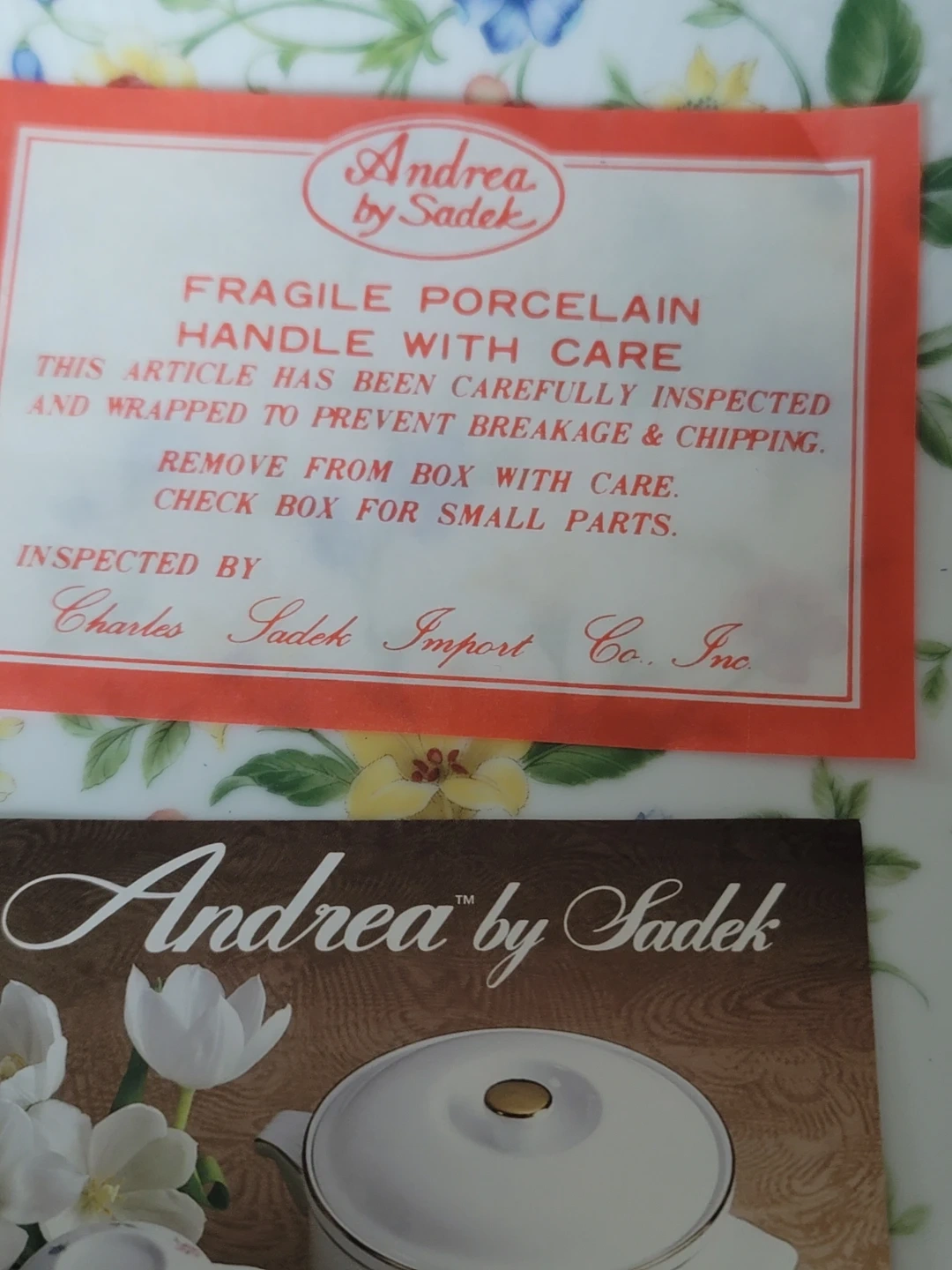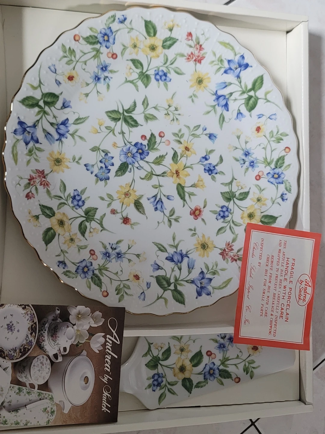 This is a new Andrea by Sadek porcelain cake stand and server set. It's decorated with a floral pattern. The stand has a scalloped edge and the set includes a cake server.