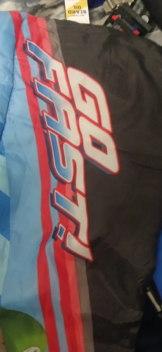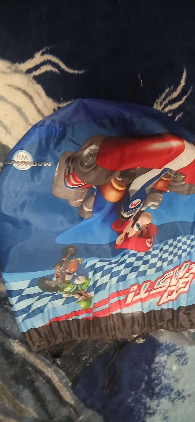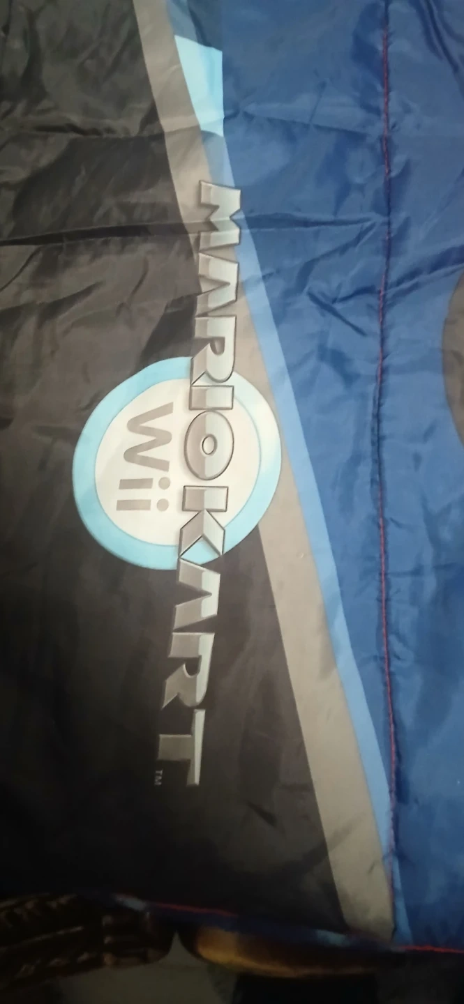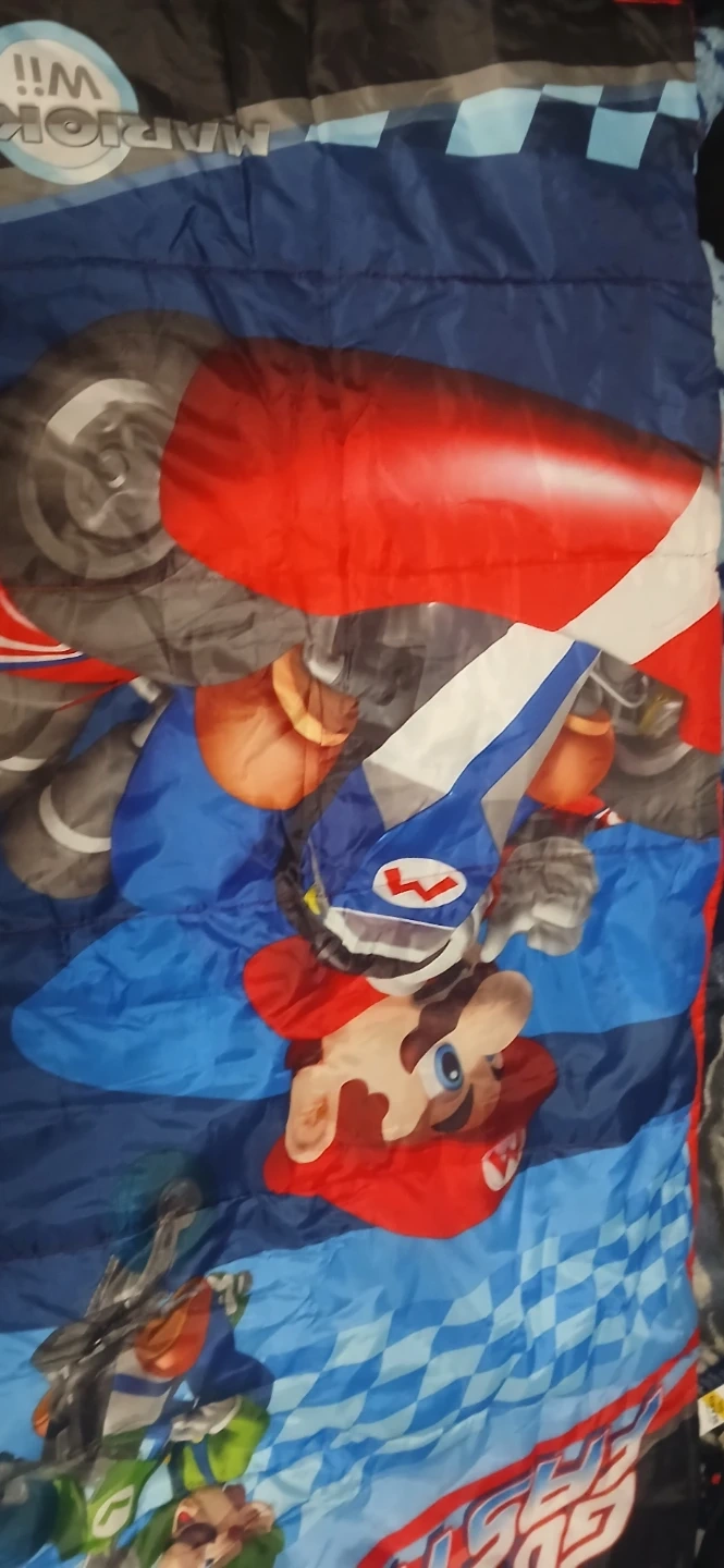 This Nintendo Mario Kart Wii sleeping bag features Mario and Luigi. It's blue with a racing theme. Perfect for any young Mario Kart fan!