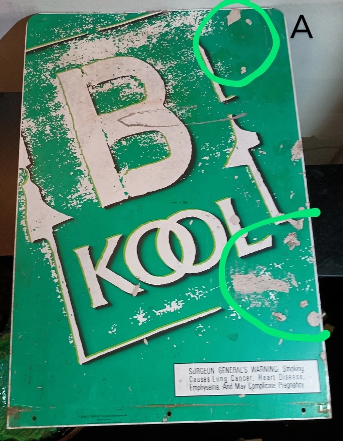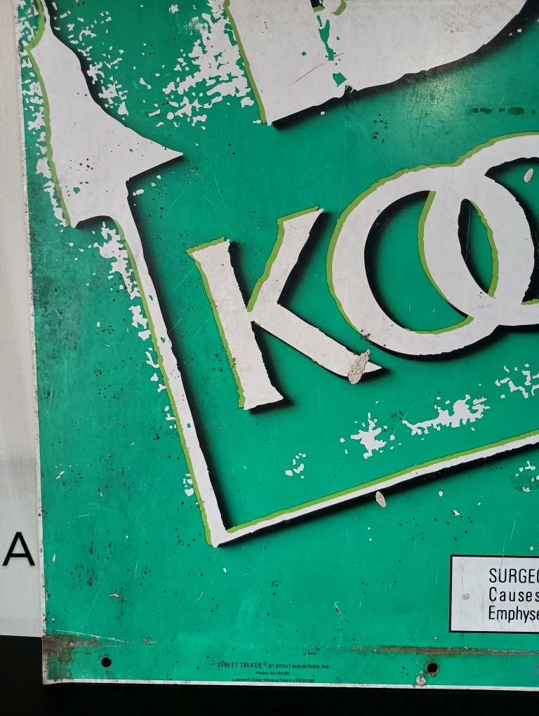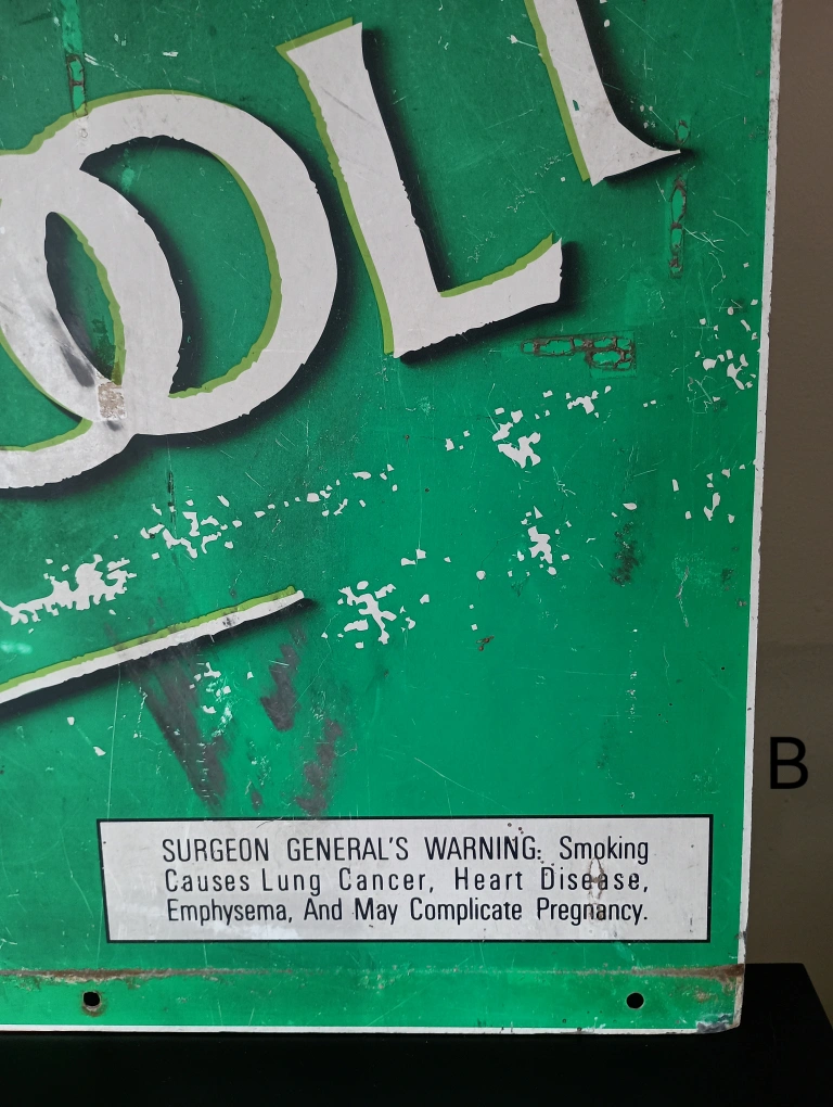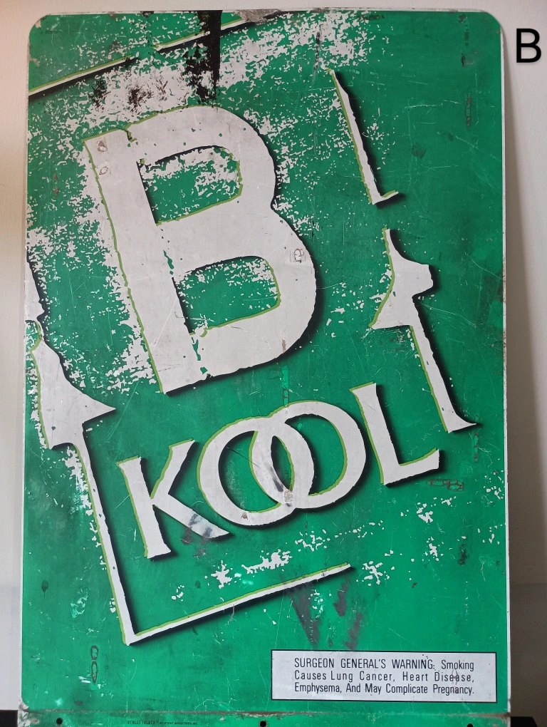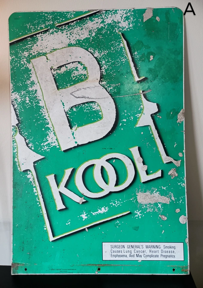 75BKool Kool cigarettes metal sign from 1997. Double sided. Has green background with white lettering. The sign has been through a lot. There are scrapes and scratches. There's two photos, one shows a cut in the bottom and the other splatters of concrete. Signs of wear and age, which adds to its charm. 36" x 24" Found a brand new pack of Bkool playing cards, matches the sign. Will iinclude it if u want it.
