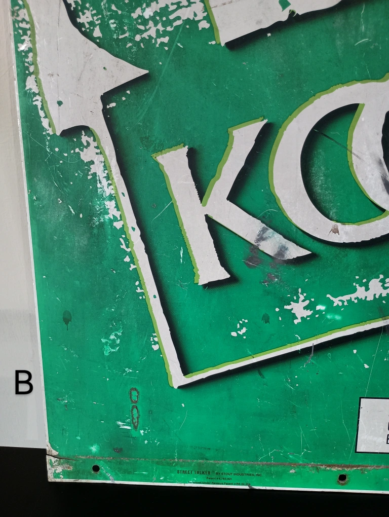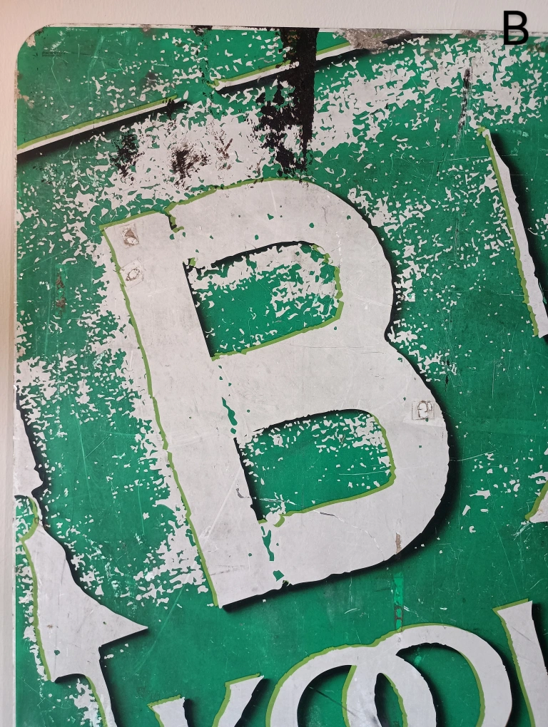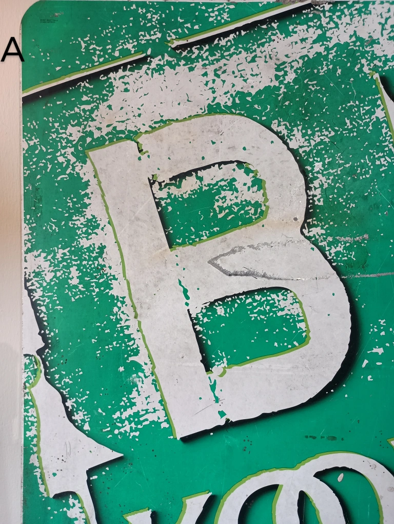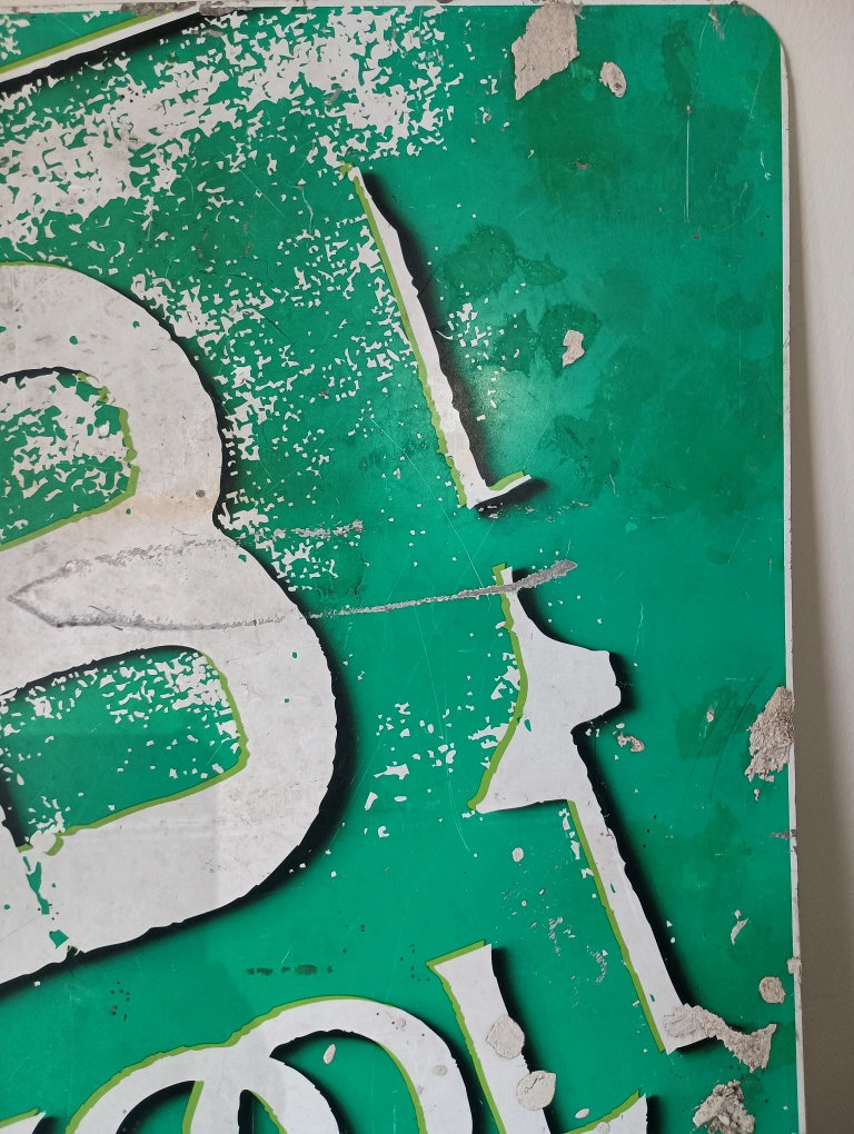 75BKool Kool cigarettes metal sign from 1997. Double sided. Has green background with white lettering. The sign has been through a lot. There are scrapes and scratches. There's two photos, one shows a cut in the bottom and the other splatters of concrete. Signs of wear and age, which adds to its charm. 36" x 24" Found a brand new pack of Bkool playing cards, matches the sign. Will iinclude it if u want it.