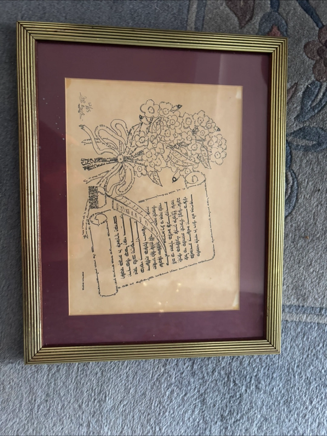 76Here's a framed piece of art featuring floral designs and calligraphy. It would be a lovely addition to any room!