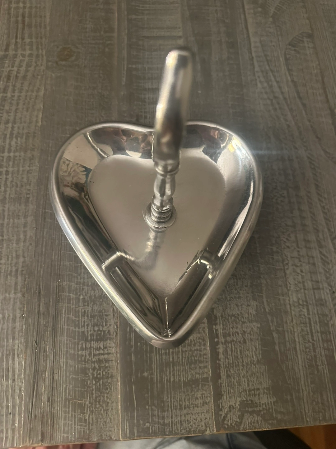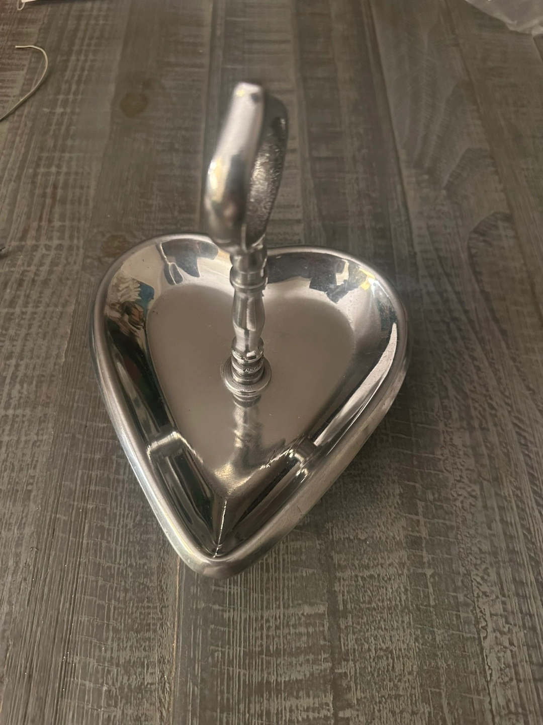 Selling a cute heart-shaped silver candy dish! It has a handle in the center, making it easy to carry. It's in good condition and would look great on any table or counter