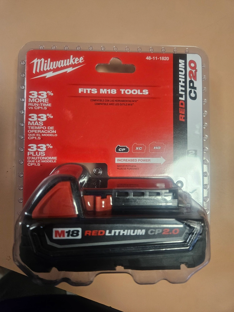 51I'm selling a brand new Milwaukee M18 RedLithium CP2.0 battery! This battery fits M18 tools and provides up to 2x more run-time and 20% more power compared to standard lithium batteries. It also offers 33% more run-time than the CP1.5 model. Get increased power and performance for your Milwaukee tools!