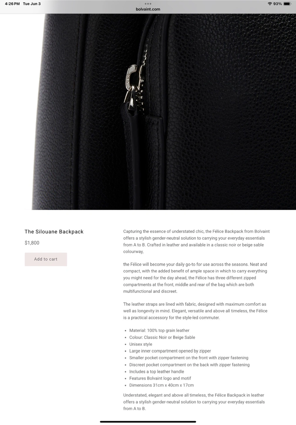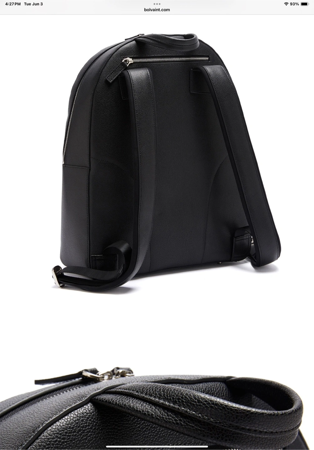 76Selling a Bolvaint The Silouane Backpack in classic noir. It's crafted from 100% top grain leather and features a unisex style. Key features include: - A large inner compartment with a zipper opening - A smaller pocket compartment on the front with zipper fastening - A discreet pocket compartment on the back with zipper fastening - Includes a top leather handle - Bolvaint logo and motif - Dimensions 31cm x 40cm x 17cm Elegant, versatile, and above all timeless, the Félice is a practical accessory for the styled commuter