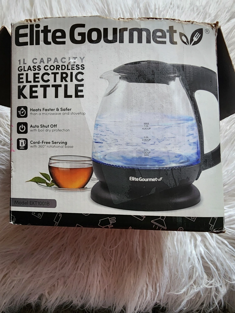 I'm selling an Elite Gourmet 1L Glass Cordless Electric Kettle! It heats faster and safer than a microwave or stovetop. It also has auto shut off with boil dry protection. The cord-free serving comes with a 360° rotational base. Box included! Lights up.