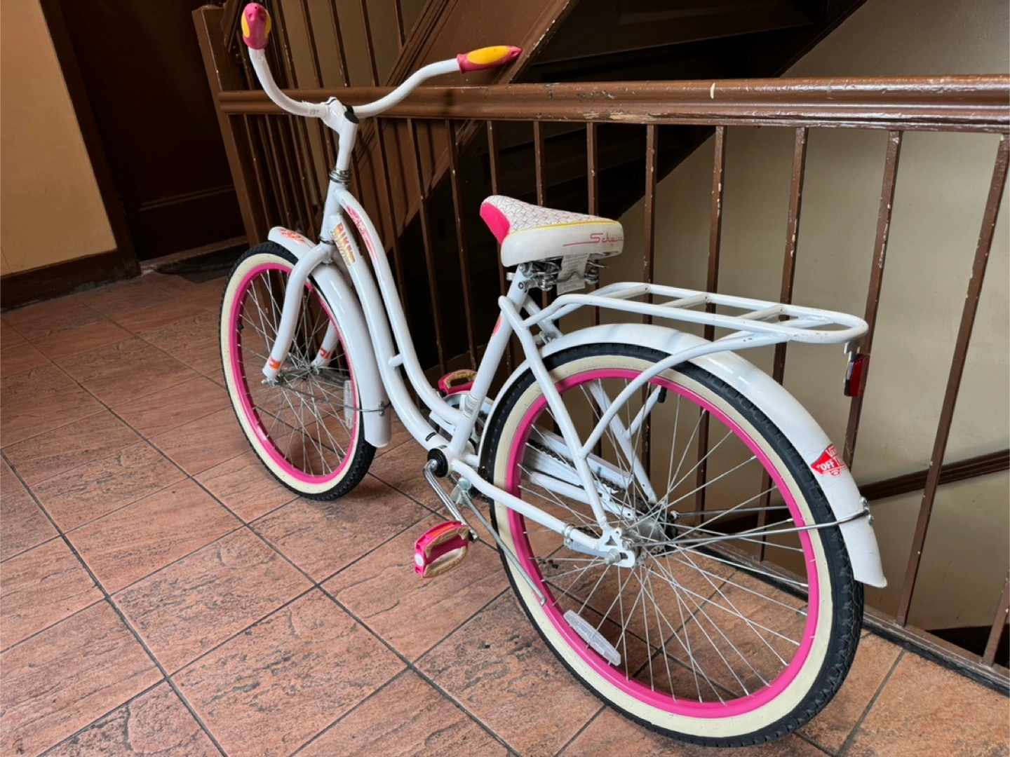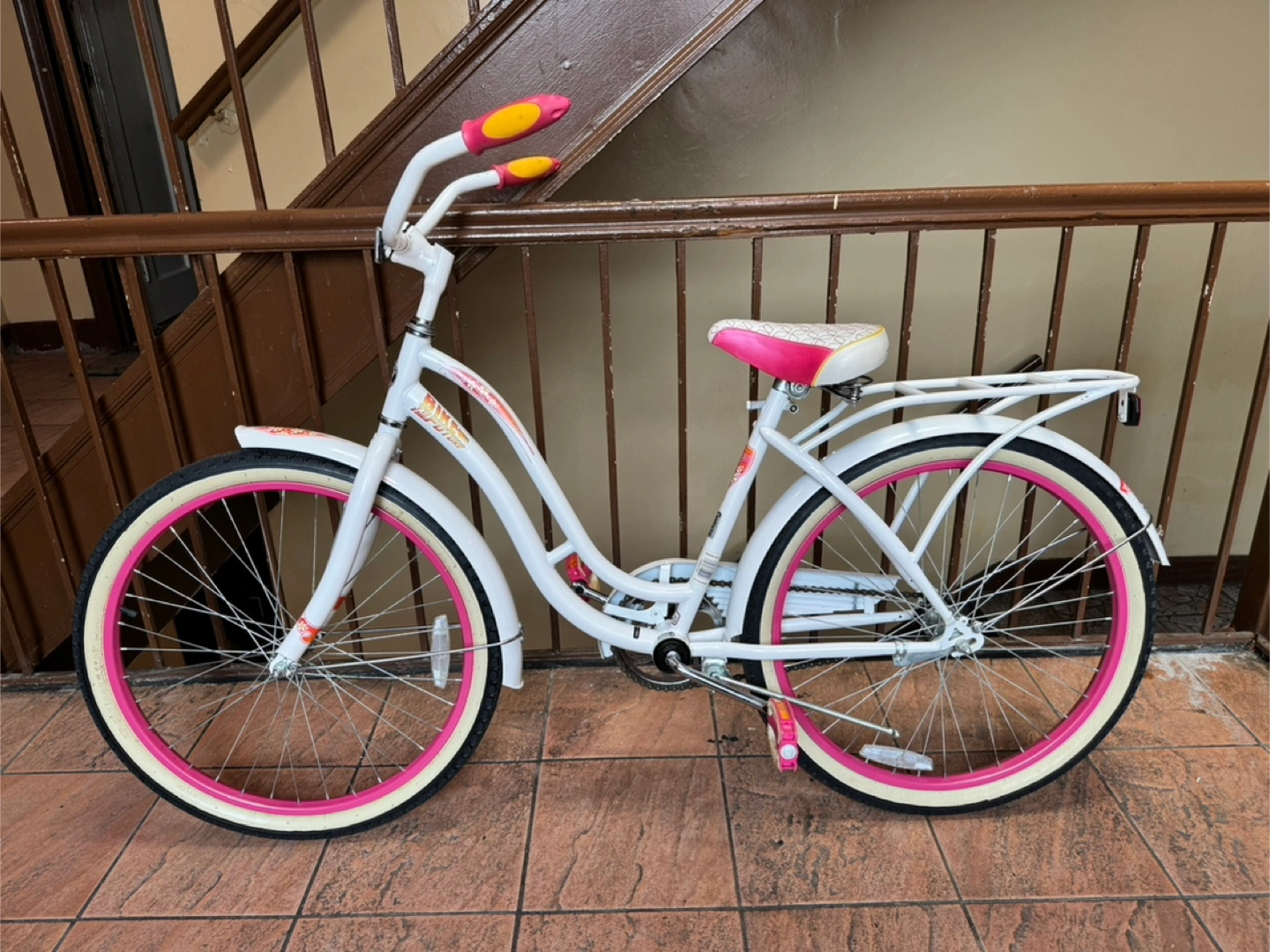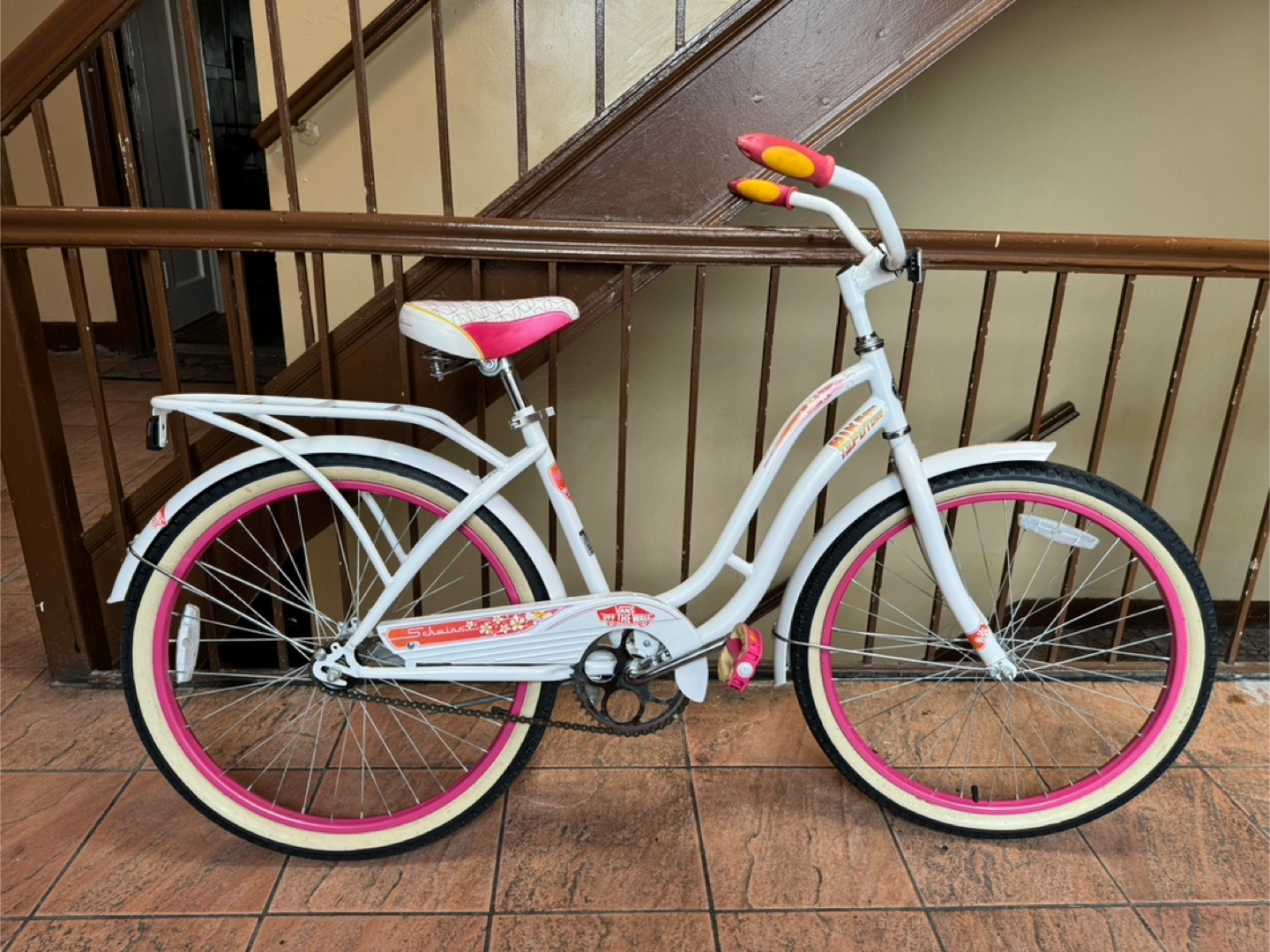 Selling a cute Schwinn women's cruiser bike! It's white with pink accents and has a comfortable seat. 24 inch wheels with coaster brake. Perfect for leisurely rides around the neighborhood or beach. Has a rear rack for carrying items