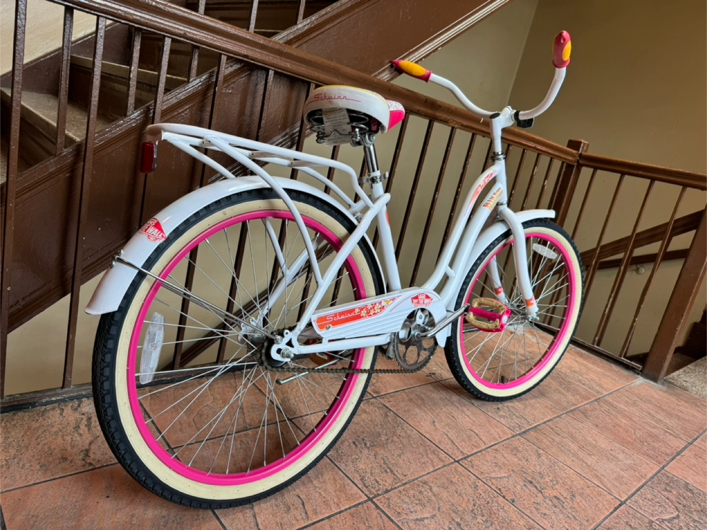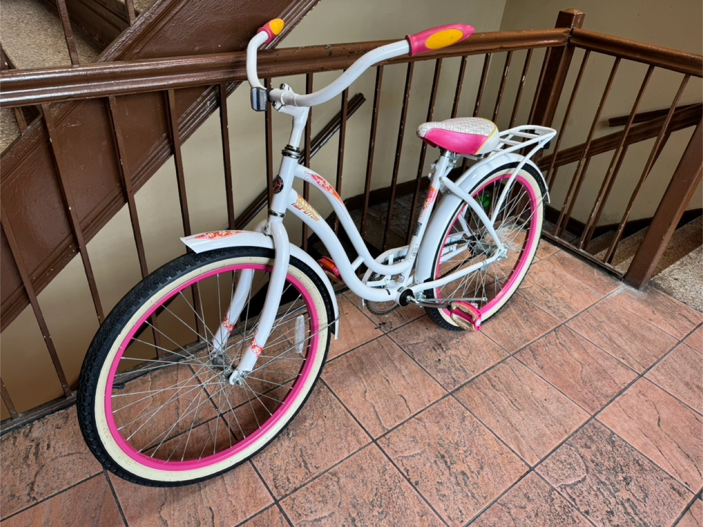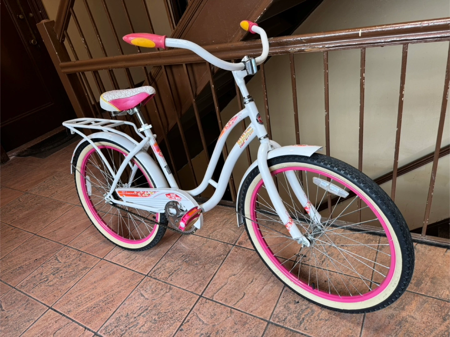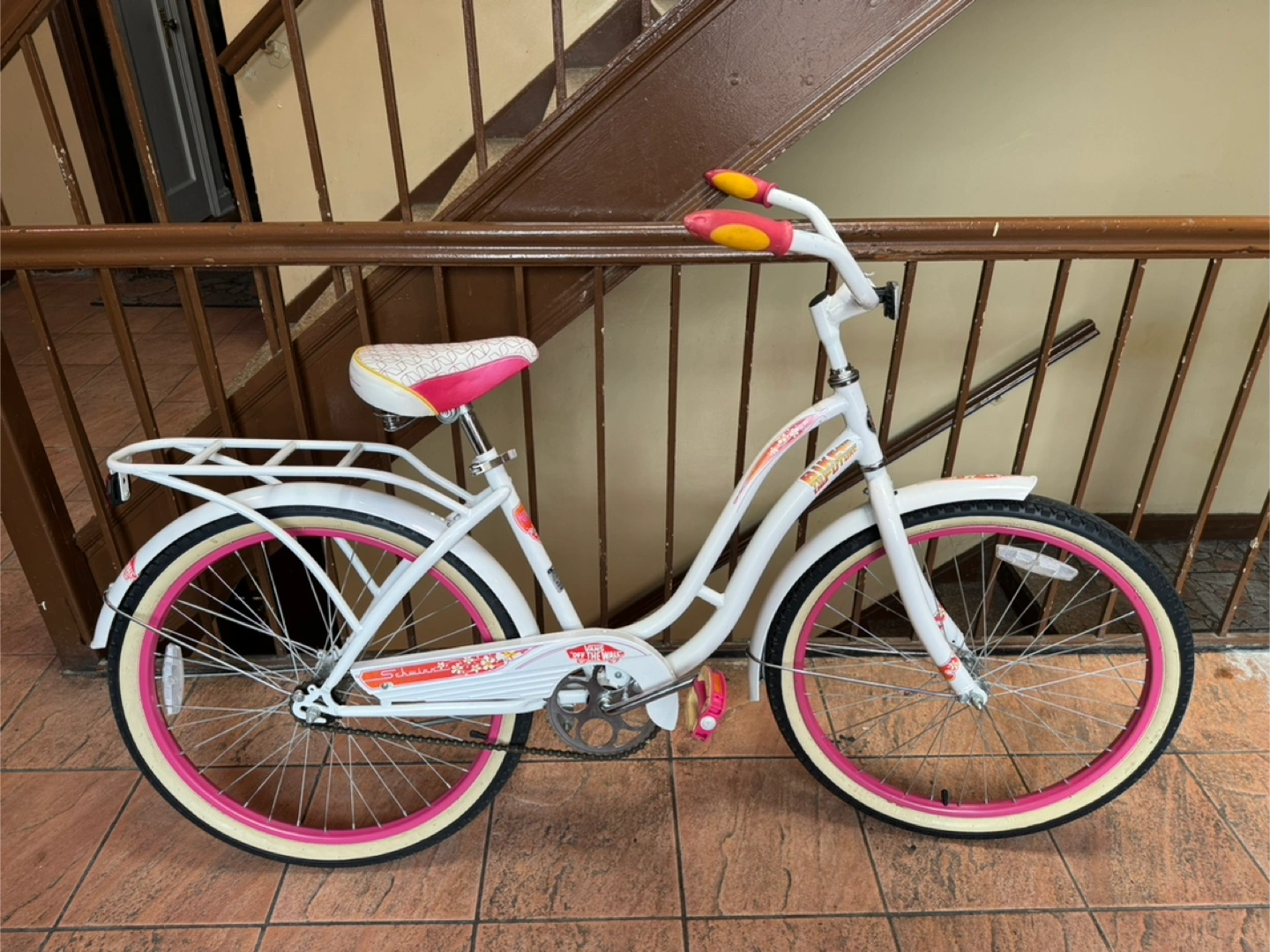 Selling a cute Schwinn women's cruiser bike! It's white with pink accents and has a comfortable seat. 24 inch wheels with coaster brake. Perfect for leisurely rides around the neighborhood or beach. Has a rear rack for carrying items