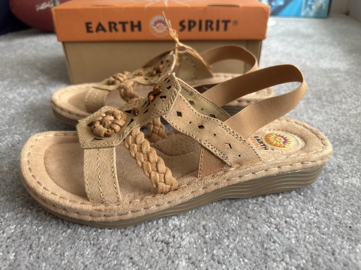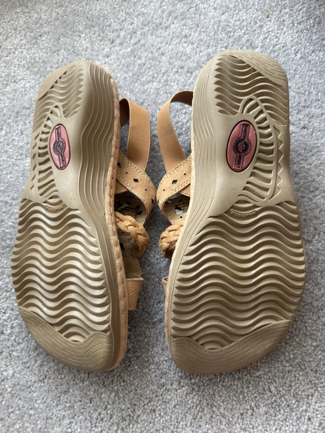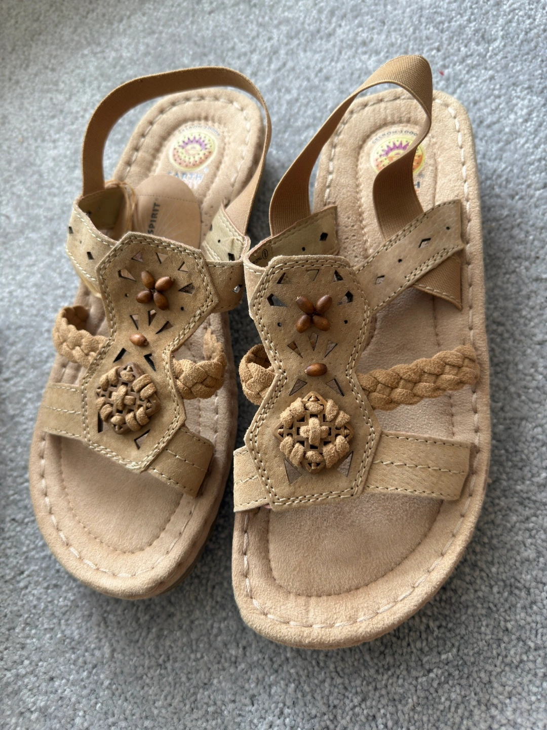Earth Spirit sandals in a neutral, earthy tone! This is a size 9 and come with the original box. They feature a comfortable design with braided detailing and elastic straps for a secure fit. Perfect for summer!