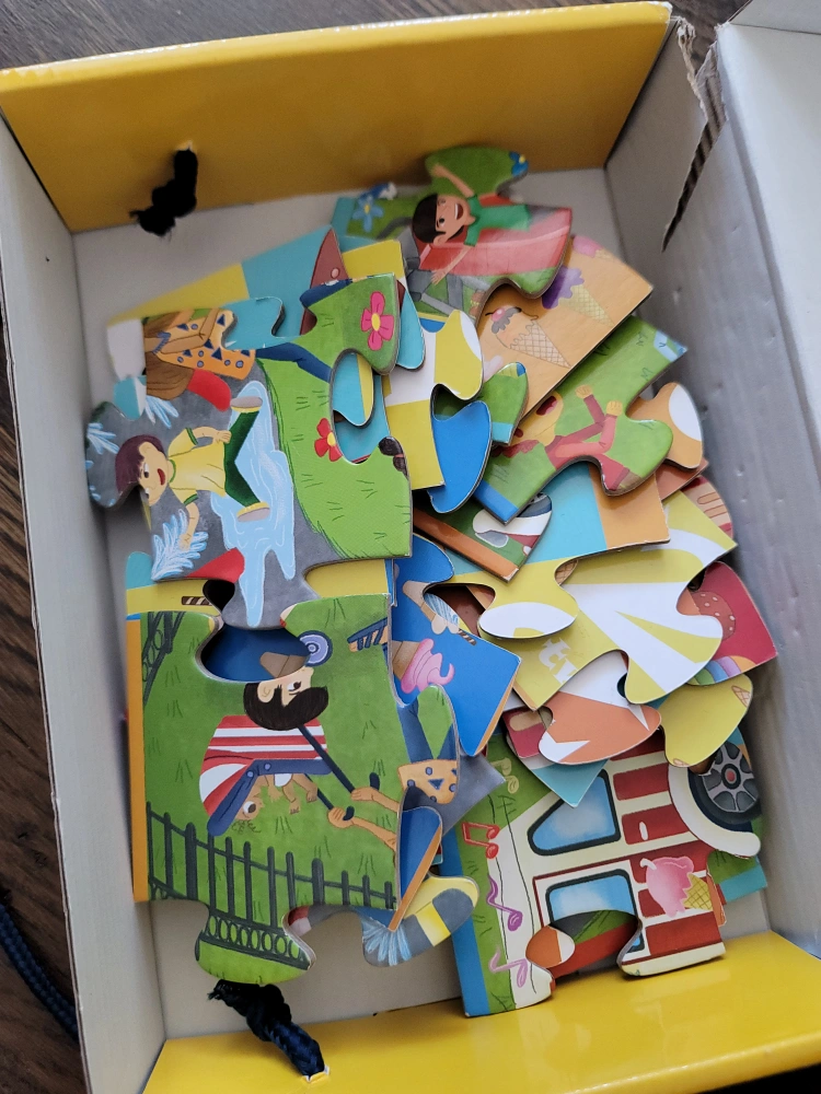 Selling an Upbounders 24-piece jumbo puzzle! The theme is splash parks and ice cream cones. Recommended for ages 3+. It's a 2-in-1 double sided puzzle. The box is included!