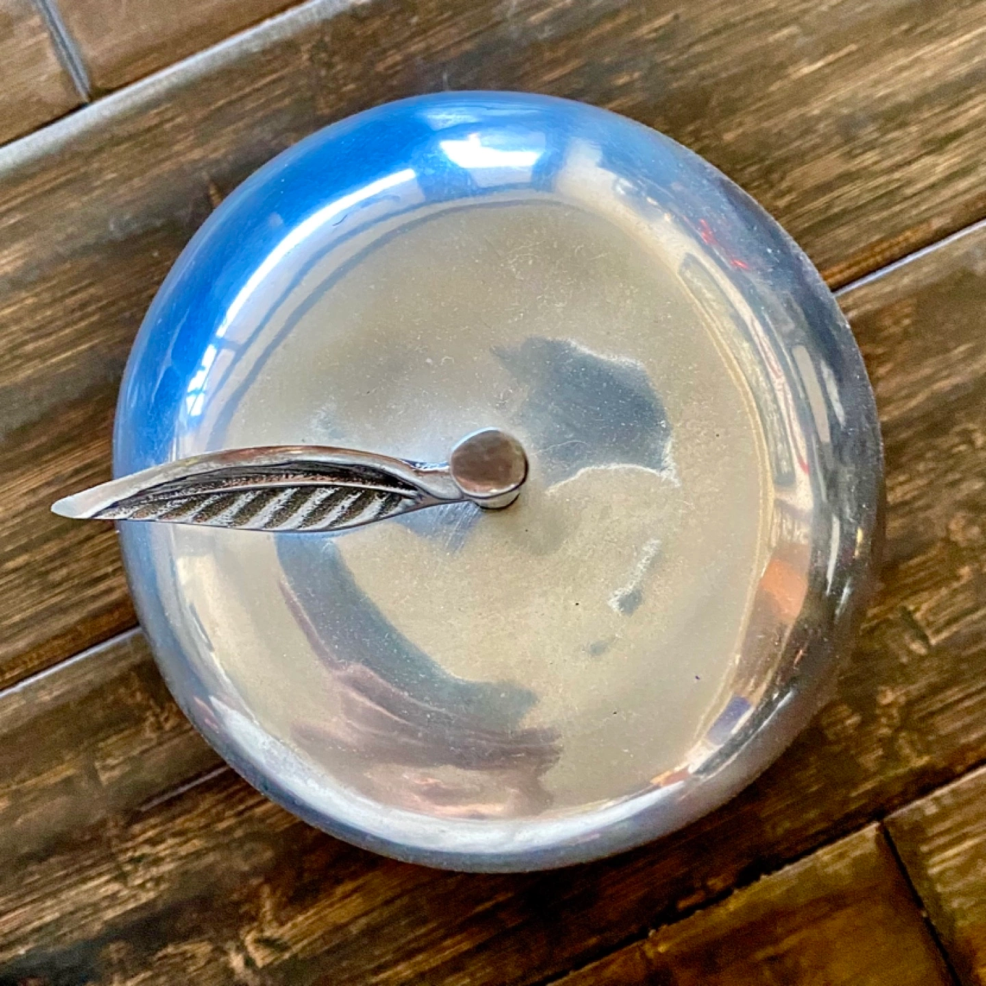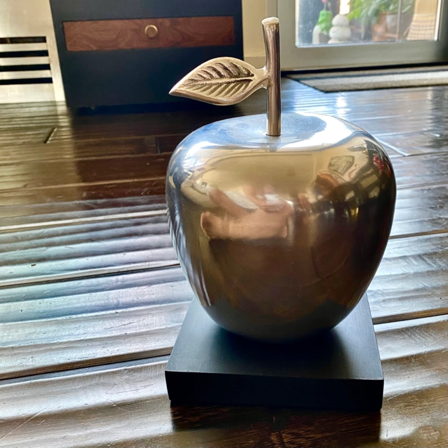 You can have the BIG APPLE in the palm of your hands! Selling this beautiful silver/chrome apple sculpture attached to a black wood base. It's in great condition, with some minor scratches consistent with age. C’MON, TAKE THE BITE …and own this conversation piece that would look great in any NYC home!
