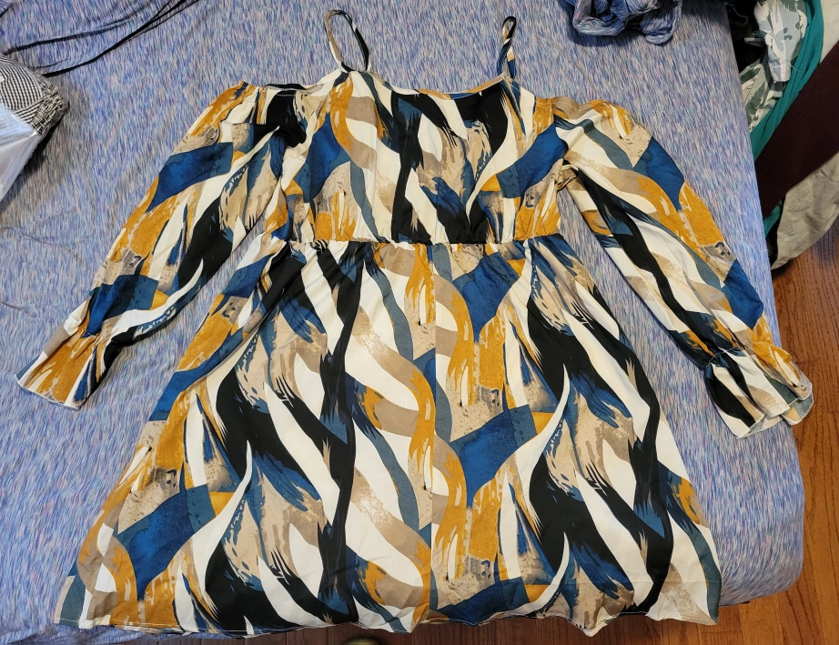 92Shein Curve dress in size 0XL! The dress features a colorful pattern in shades of blue, tan, black, and white. It has an off-the-shoulder design with long sleeves.