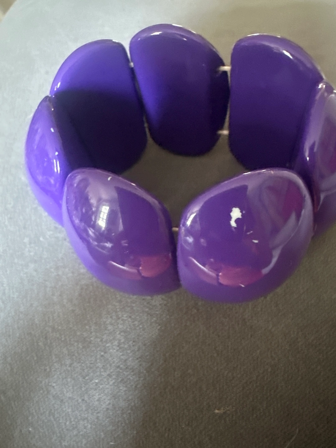 This is a purple beaded bracelet. It's in good condition and ready for a new home! There is a little scratch.