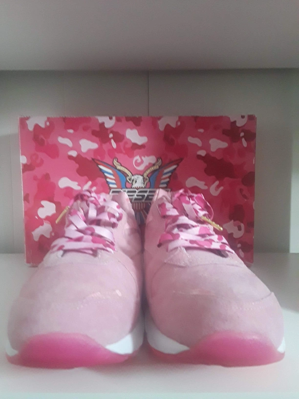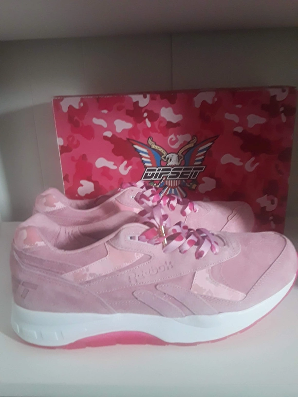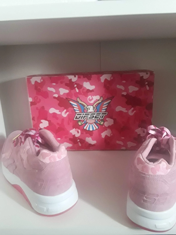 Selling a pair of Reebok sneakers in a pink camo design, featuring the Dipset logo. These are sure to make a statement! I don't think I have the Box for em. worn once.