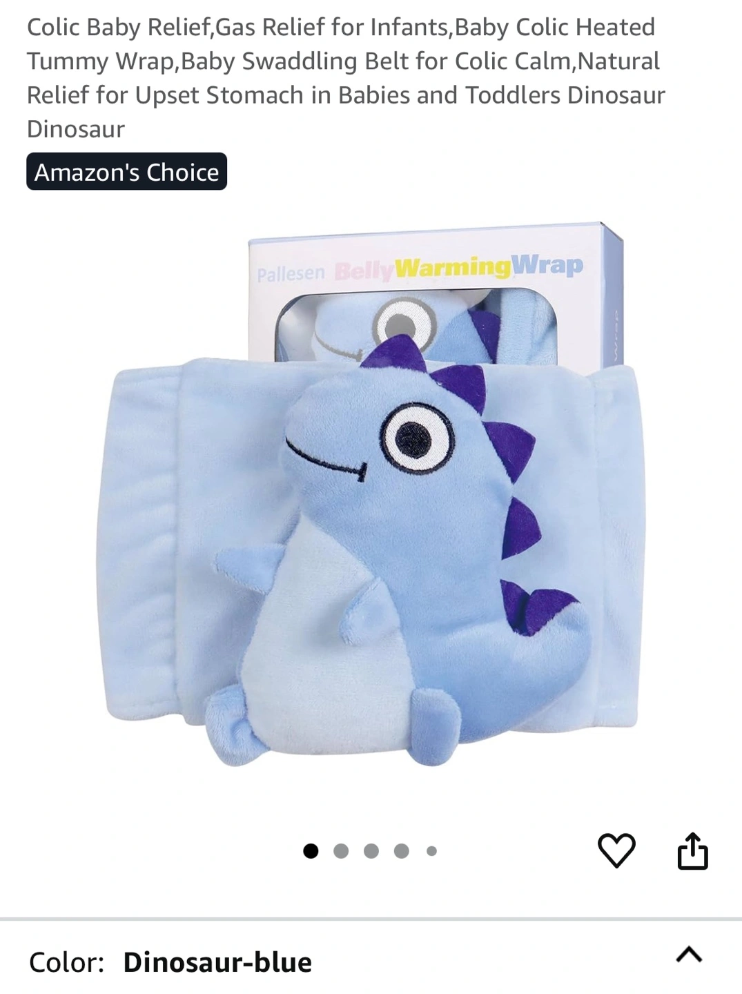 I have a Pallesen BellyWarmingWrap for colic baby relief. It's designed to provide gas relief for infants and help with upset stomachs in babies and toddlers. The color is a cute dinosaur-blue!
