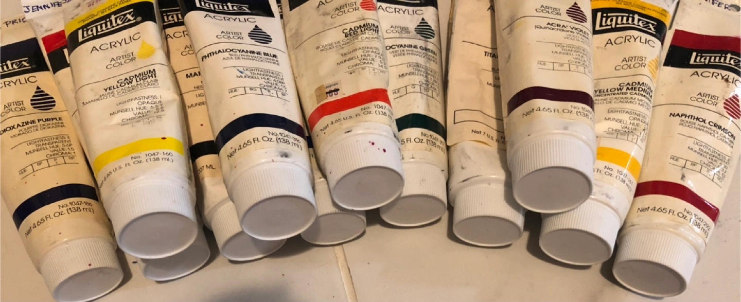 Includes acrylic paints, charcoal, box cutter, erasers and more