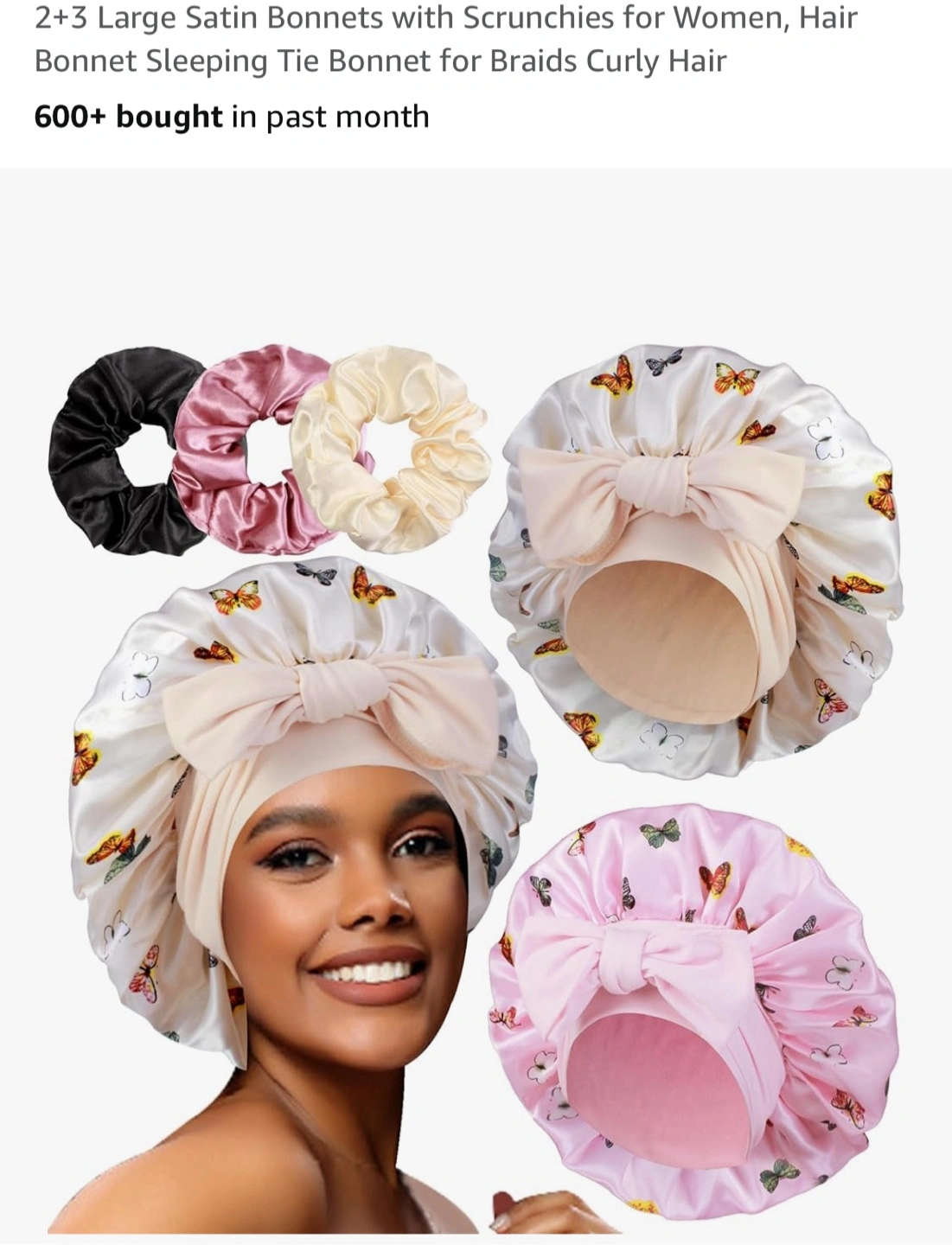 Selling a set of satin bonnets with scrunchies. These are great for protecting your hair while you sleep! They're designed for women with braids or curly hair. Get a good night's rest while keeping your hair looking its best