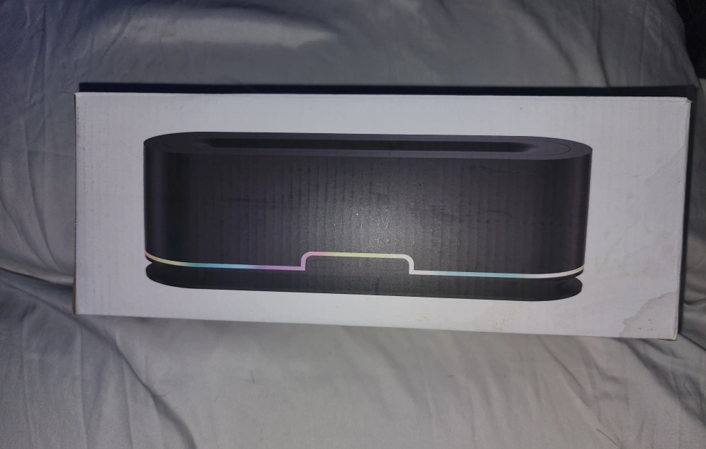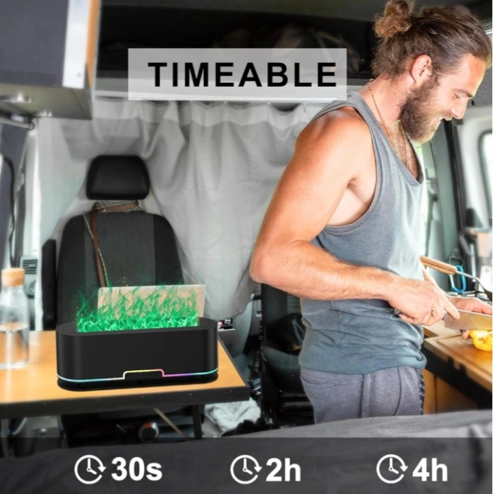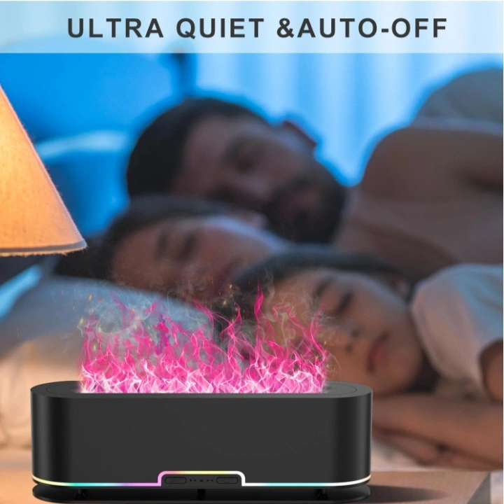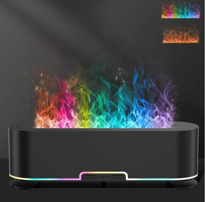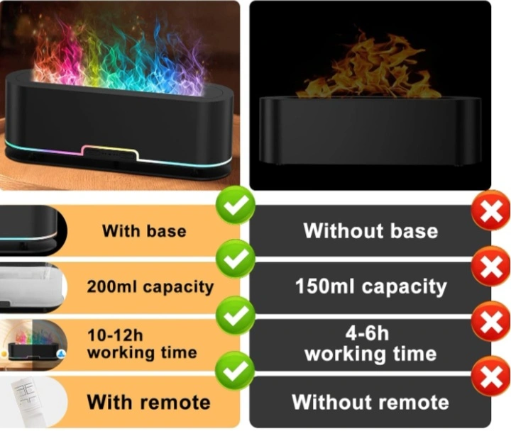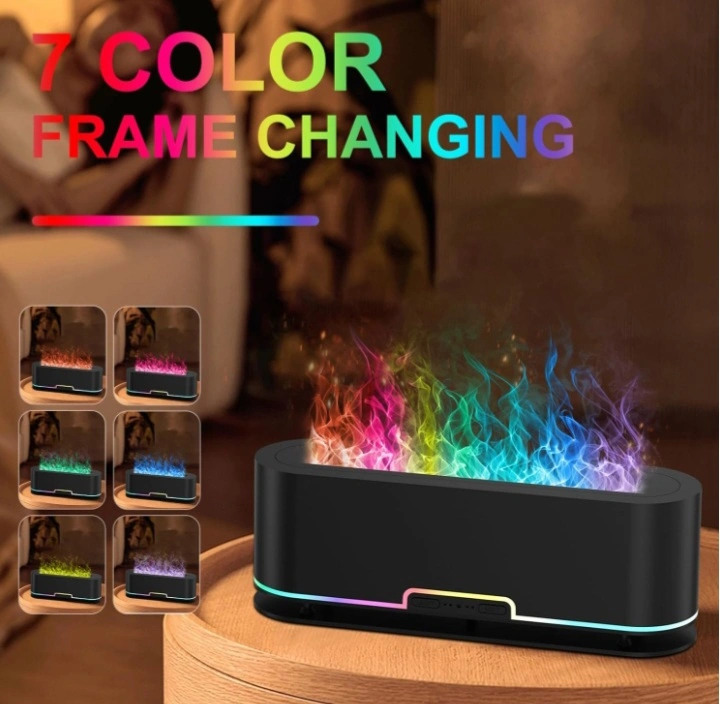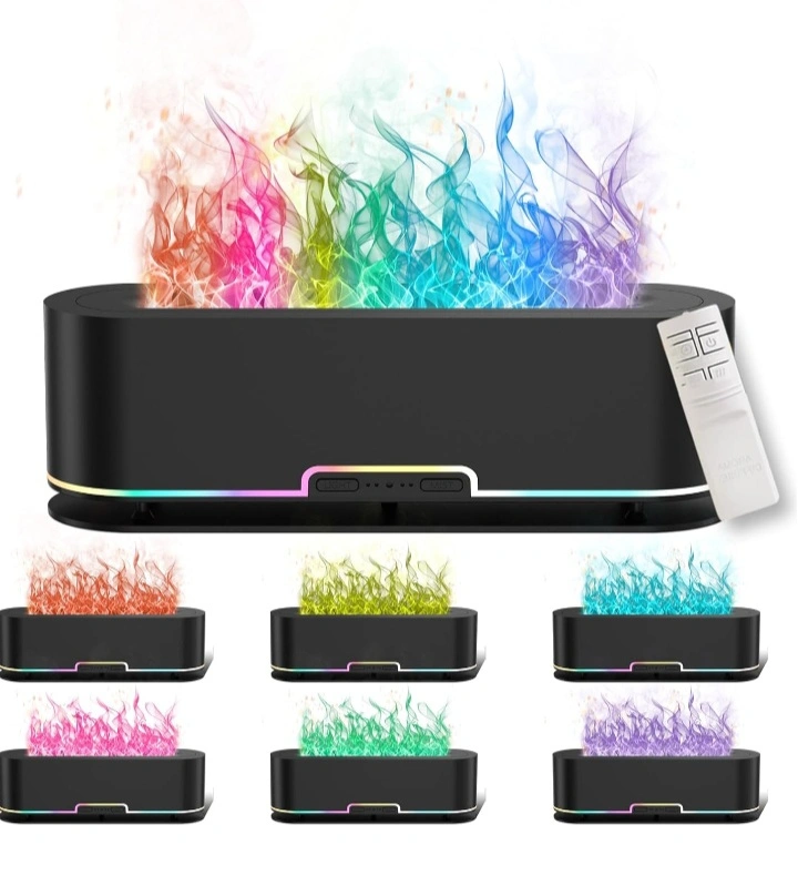This is a 7 color frame changing flame effect lamp. It has a 200ml capacity and a 10-12 hour working time. It comes with a base and a remote. It is ultra quiet and has an auto-off feature.