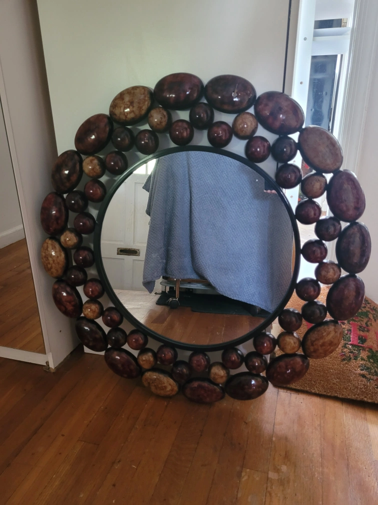 Selling a unique round mirror featuring a decorative border of polished stones in varying shades of brown. It's a lovely piece to add some natural texture to your space!