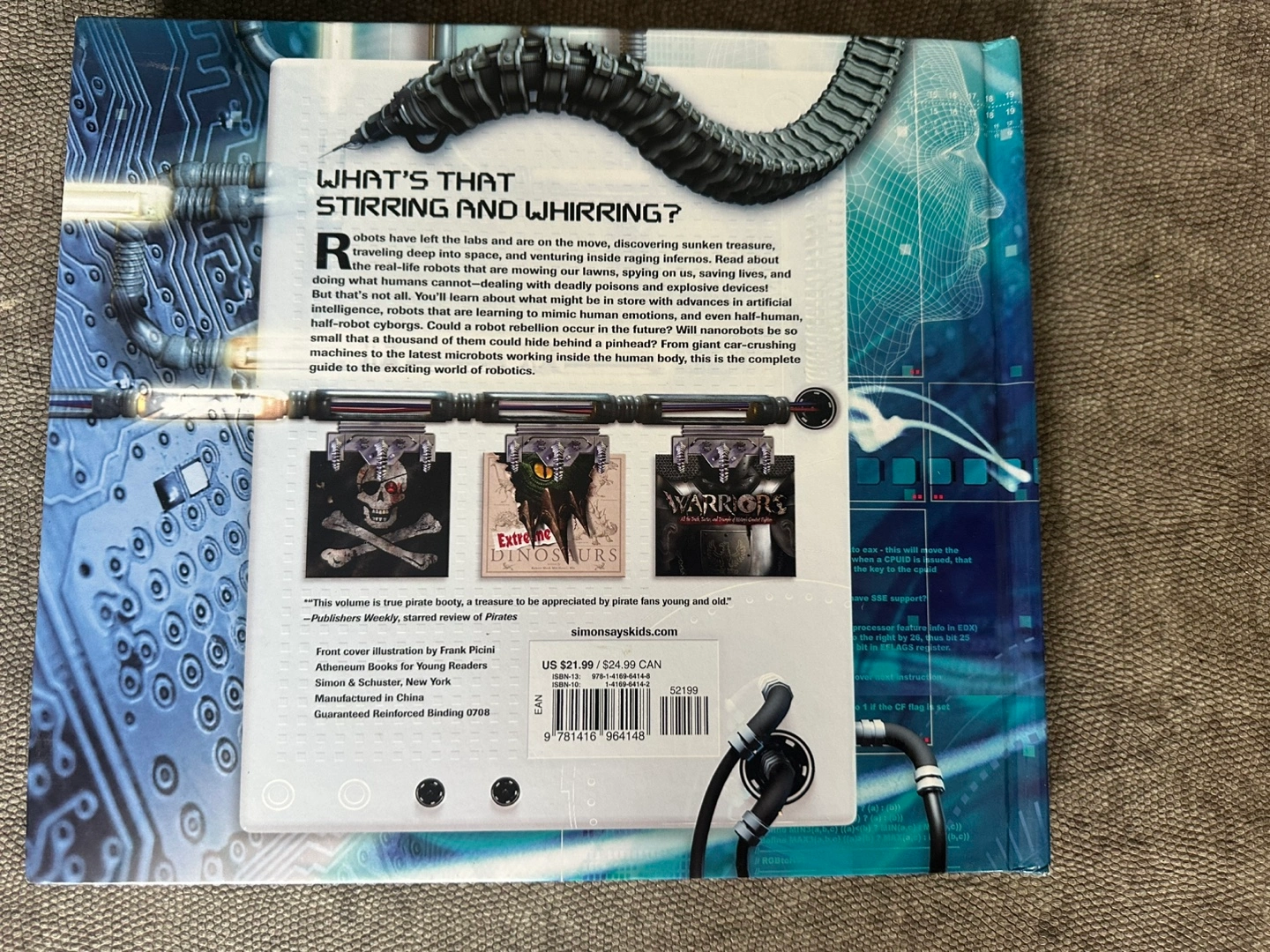 Selling the book Robots by Frank Piscini! It's a hardcover book published by Atheneum Books for Young Readers and Simon & Schuster. It's a fascinating guide to the exciting world of robotics. The original price was $24.99 CAN