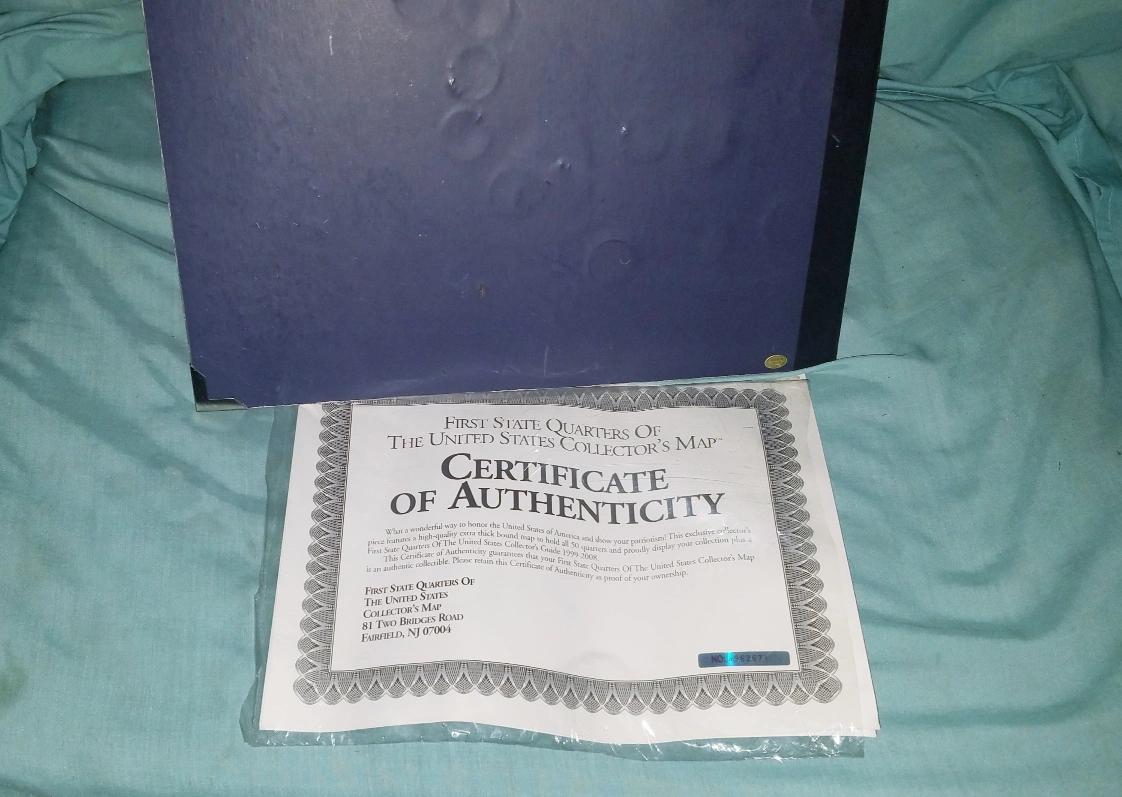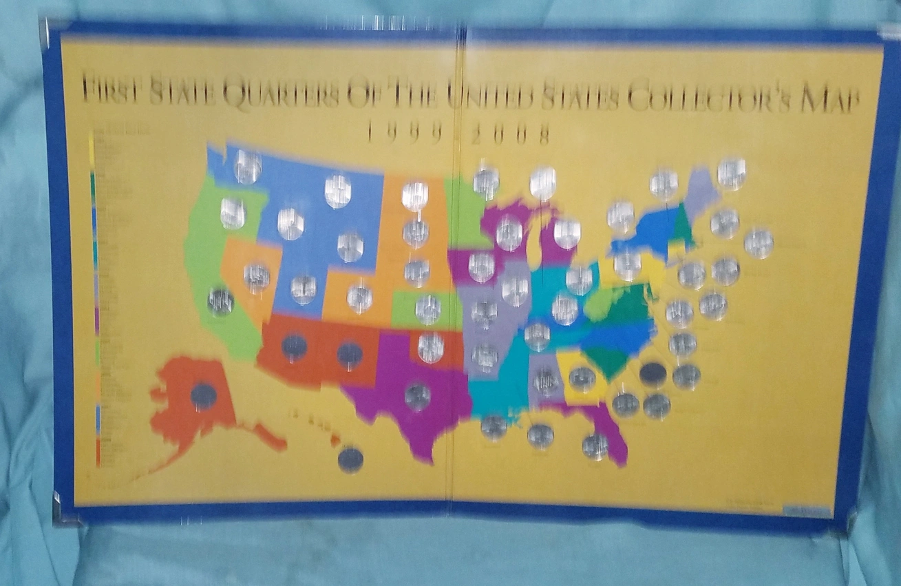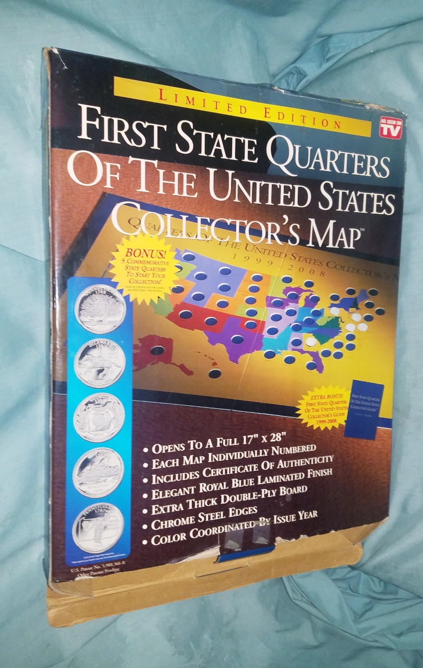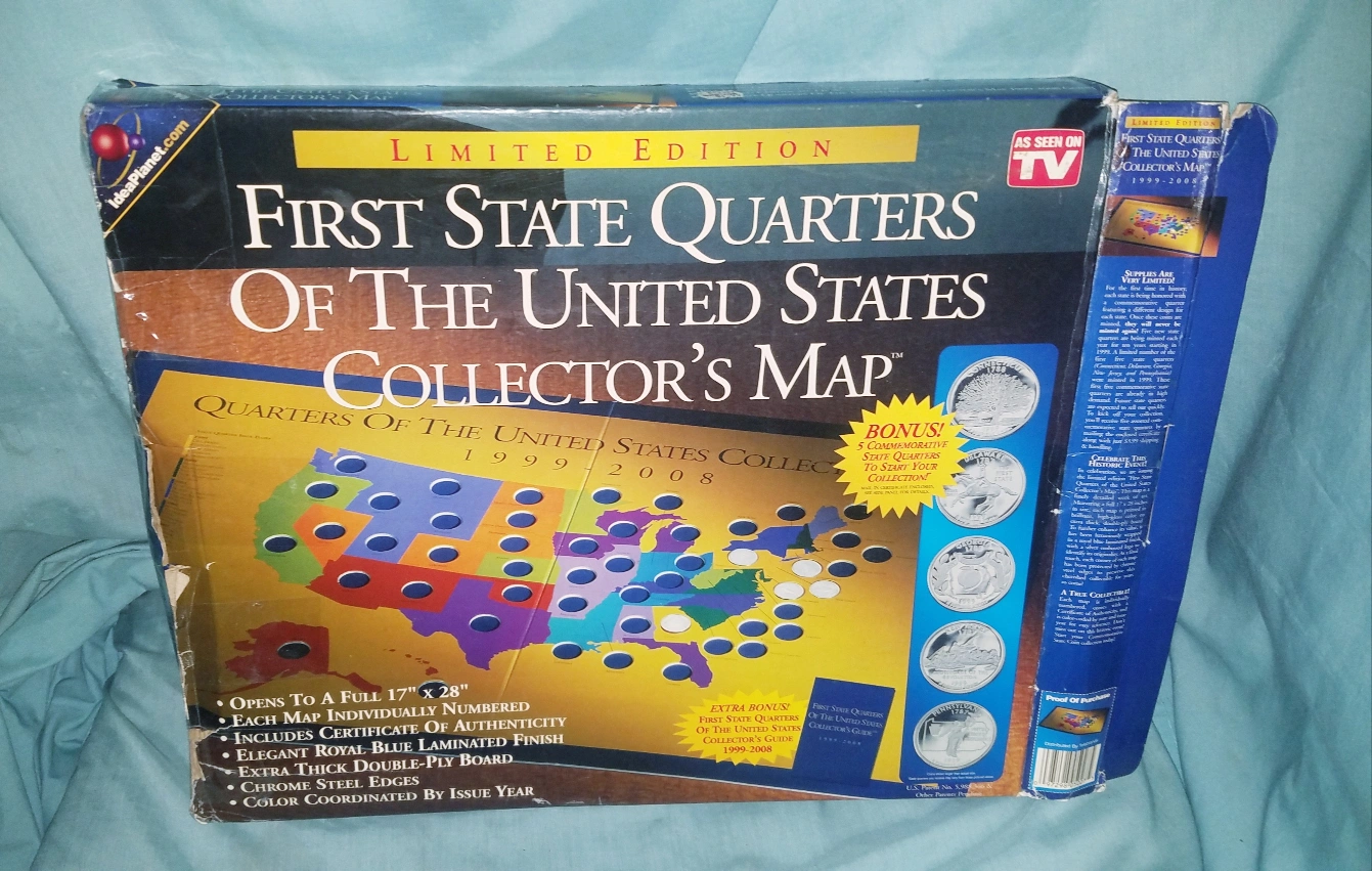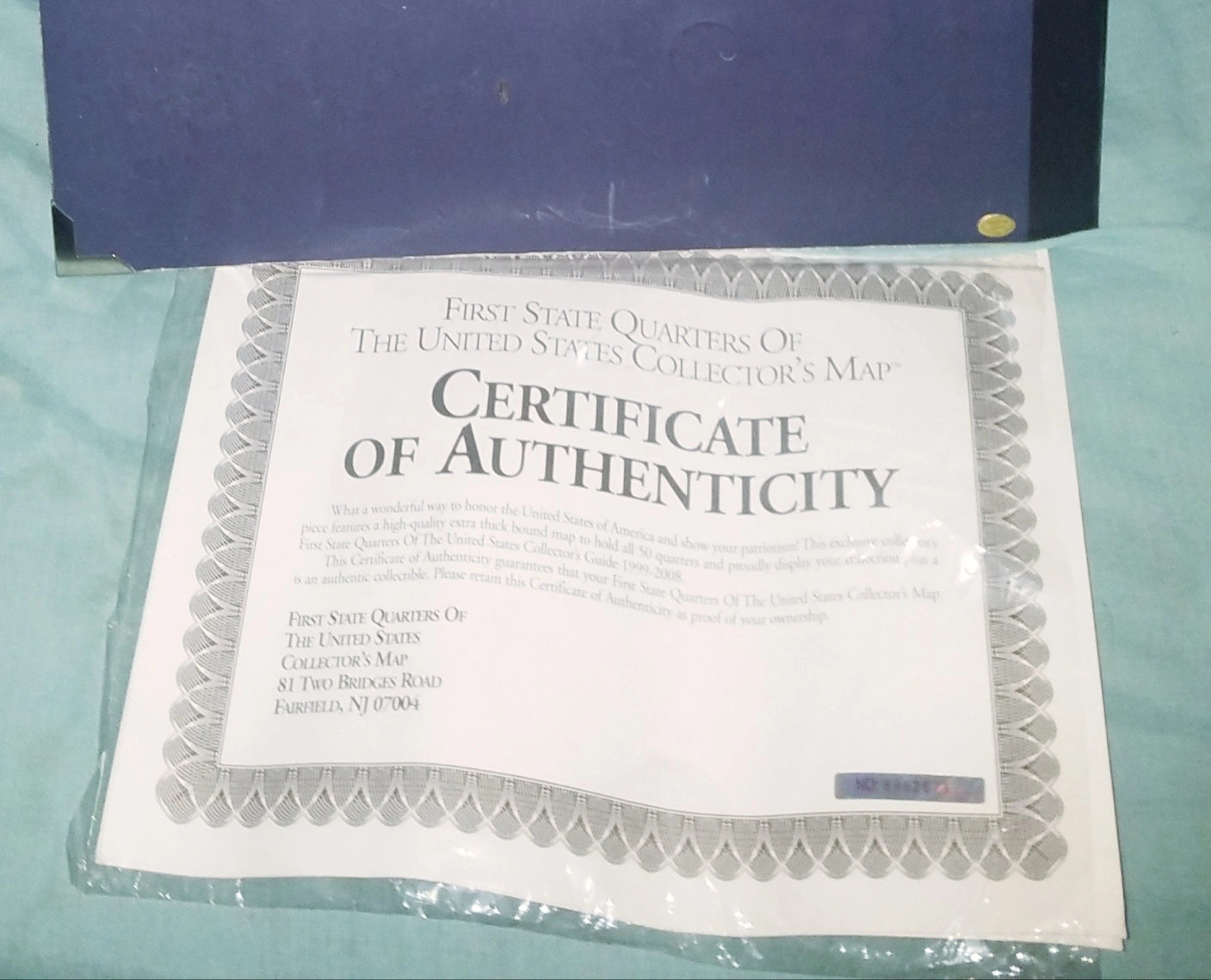 76Map is in Excellent Condition....Has 45 State Oringinal Quarters Booklet Has Wrinkles COA was previously rolled up.. Could Be Flattened out and Framed Box Has Lot of Shelf Wear Please See Pics.... Check Out My Page For More Great Items!! The "First State Quarters of the United States Collector's Map" is a map designed to hold and display a collection of 45 state quarters from the United States. It is manufactured in the United States and is not a modified item. This collector's map allows enthusiasts to showcase their state quarter collection in a visually appealing and organized manner, making it a great addition to any numismatic collection or a fun way to engage with the history and culture represented by each state quarter.