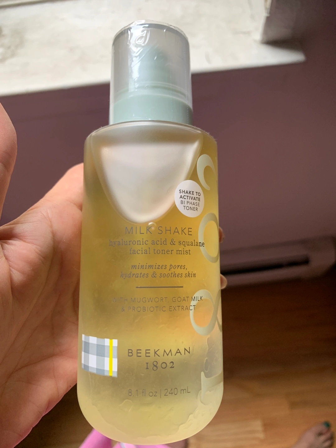 Selling a Beekman 1802 Milk Shake hyaluronic acid & squalane facial toner mist. It minimizes pores, hydrates, and soothes skin. Contains mugwort, goat milk, and probiotic extract. It's 8.1 fl oz / 240 mL, so it's perfect for travel or everyday use! Shake to activate the bi-phase toner