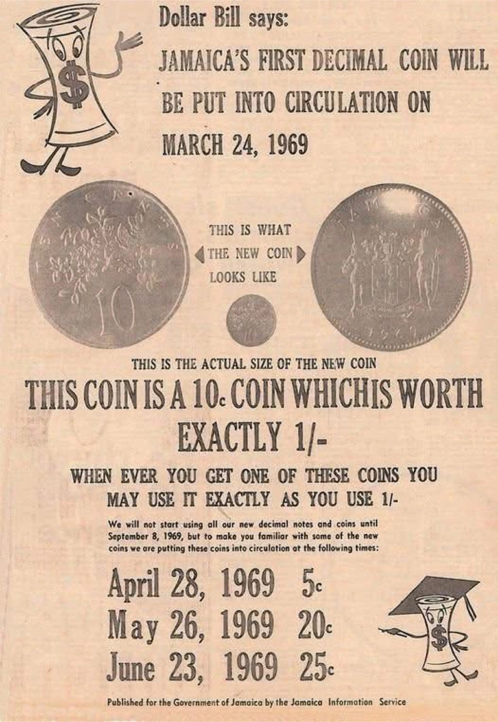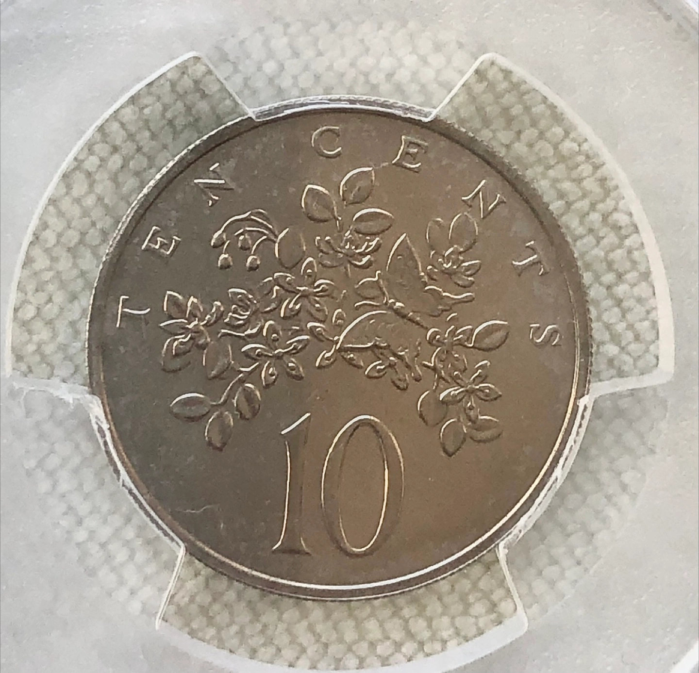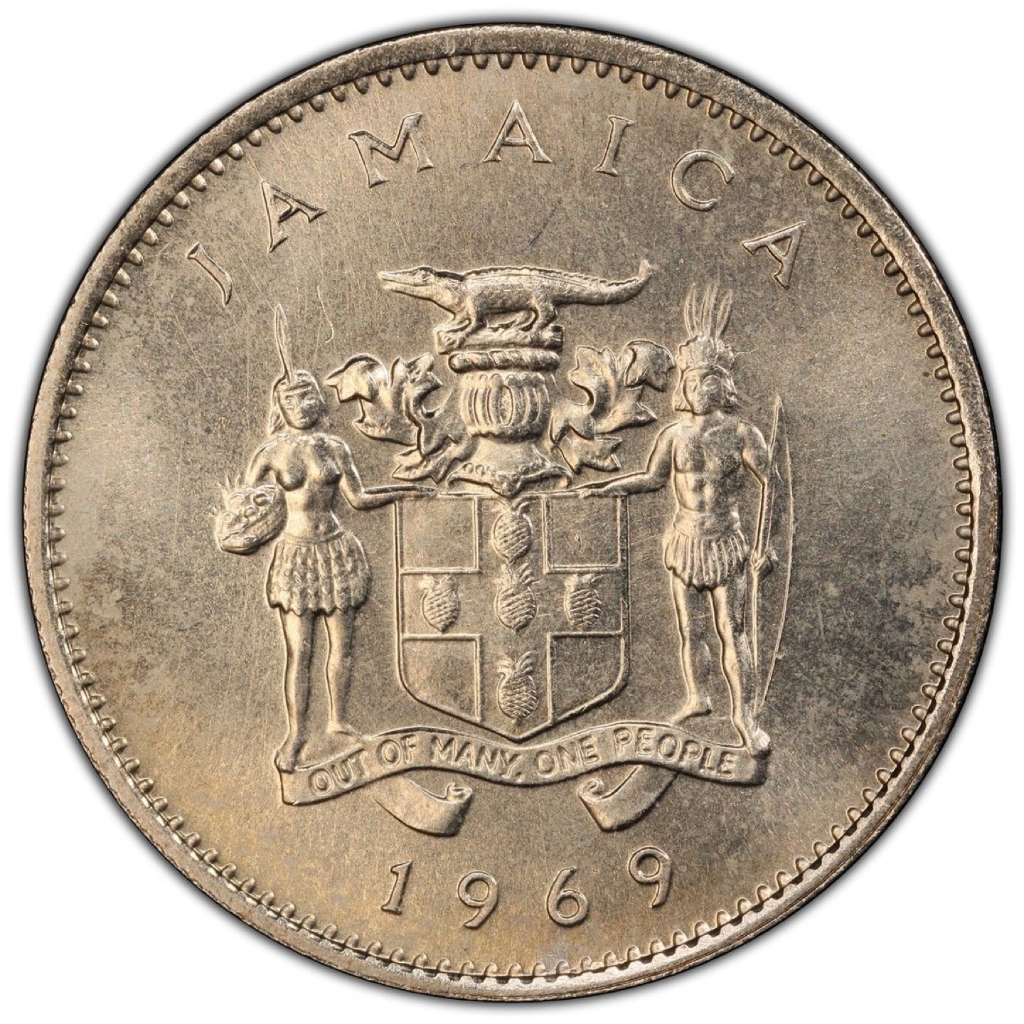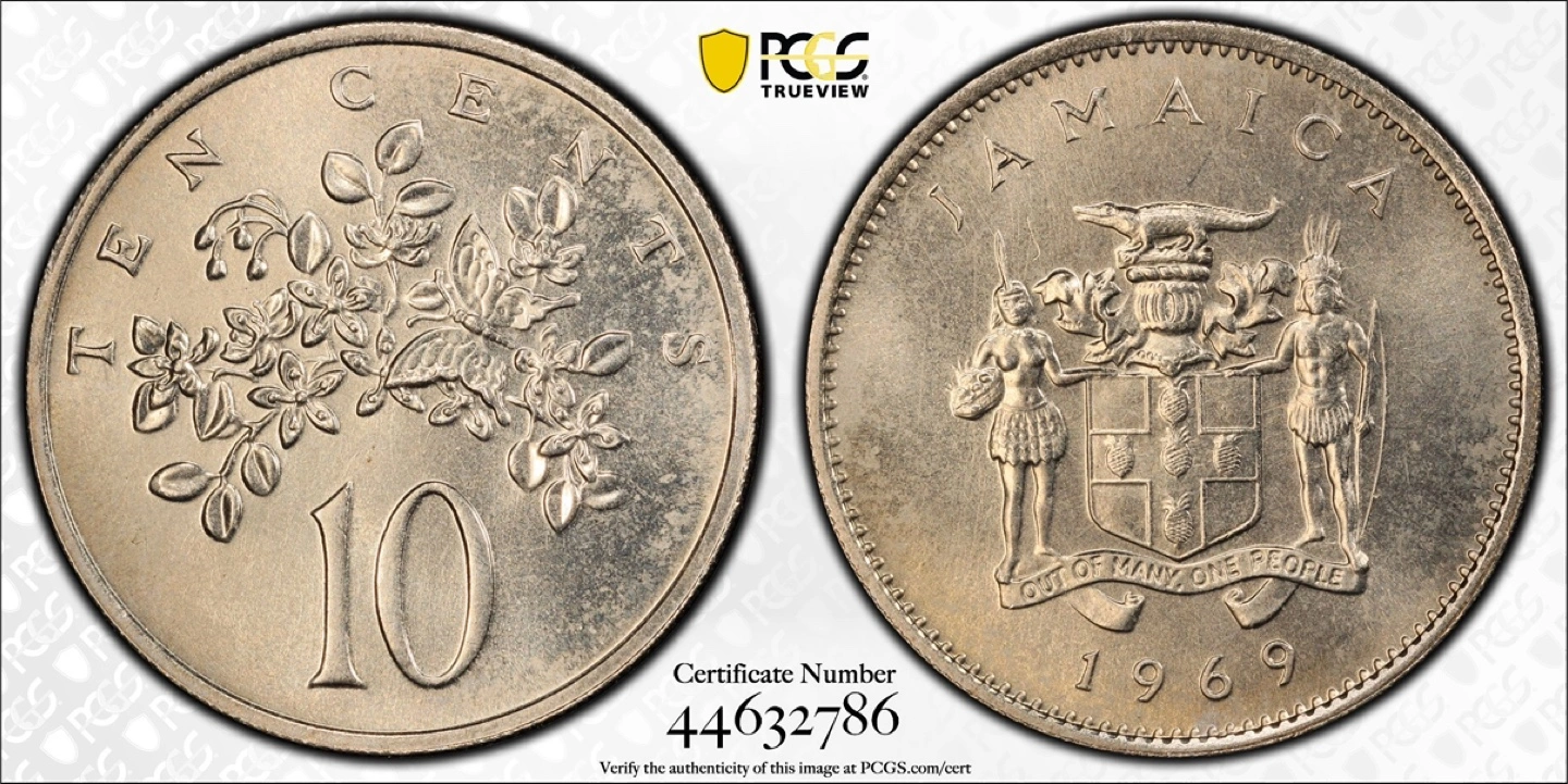 This is a PCGS graded Mint State 65 1969 Jamaican ten cents coin. 1969 was the first year that Jamaica issued its own coinage. Prior to 1969, Jamaica used UK pennies, sixpence, schillings, and half crowns.