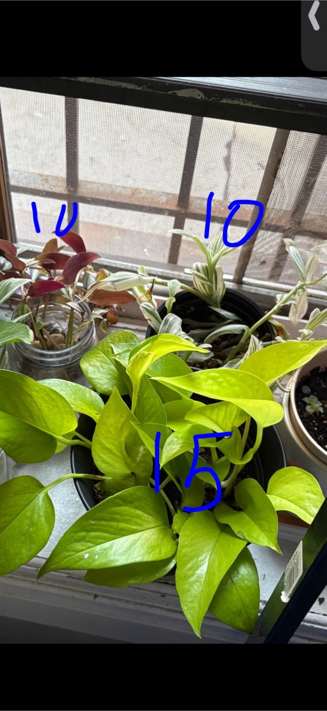 Selling various potted plants as shown in the pictures. Prices range from $10 to $15 depending on the plant. They're all looking healthy and ready for a new home!